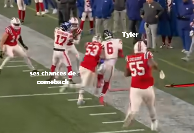 Likely qui fumble sur la 1yd line, une OPI assez douteuse sur le TD de Flowers… Lamar me torpille déjà assez comme ça avec ses fumbles et son interception mais en plus y’a RIEN qui va à côté non plus. Il me détruit mes weeks putain. S’faire enculer le keeper.