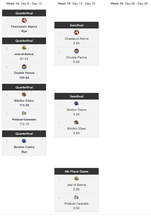 Beau tir groupé entre 80 et 86pts : @Max mange la feuille mais se défait de @RilletteDuQuintal pour rejoindre @Androquest en demis, tandis que @Tyler gagne de 3pts contre @sumvol pour aller jouer contre @Val.