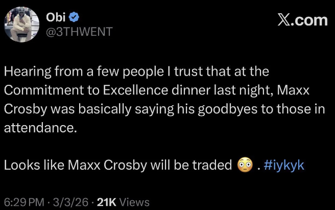 Câest donc bien Baltimore. Premier choix 2026 (14Ăš) et premier choix 2027 pour Maxx Crosby.