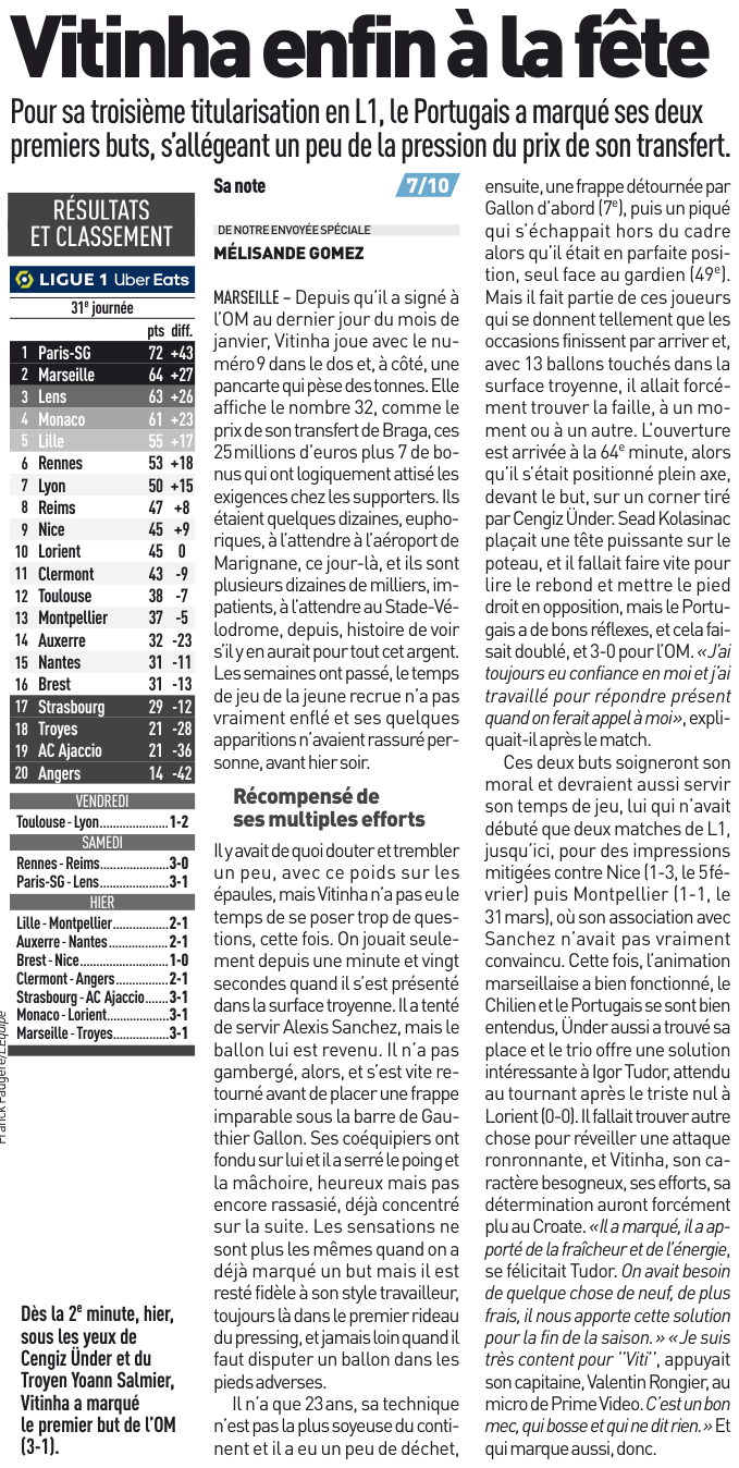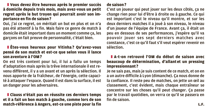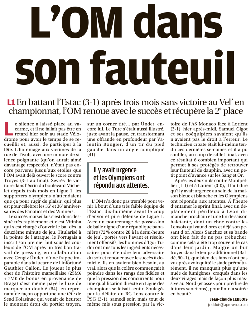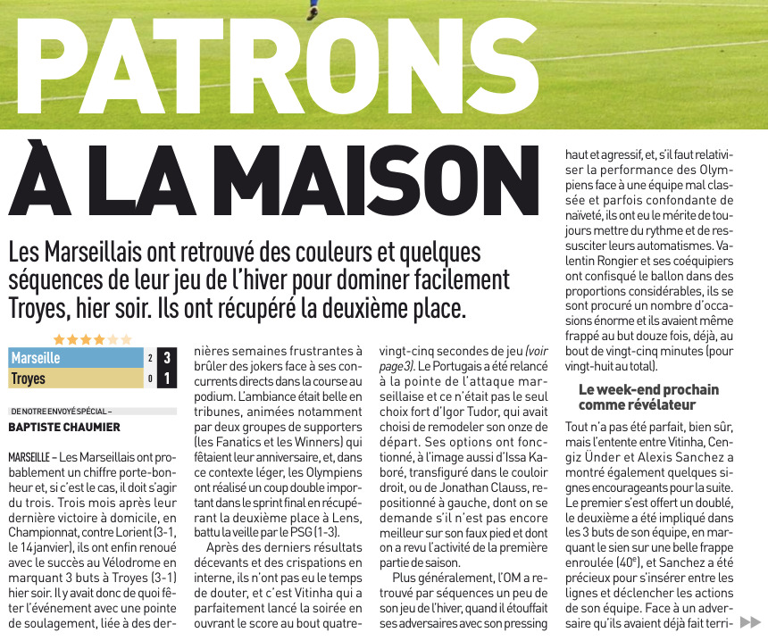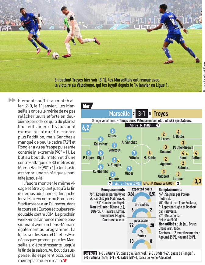 Encaisser contre cette Ă©quipe troyenne fait mal. Mais vu les 90 minutes prĂ©cĂ©dentes, on peut plaider le petit accident. Ăa arrive. LâOM est deuxiĂšme et reprend confiance en son jeu, en son collectif et individuellement avant dâaller Ă Lyon, qui revient en forme et qui a une bonne occasion de se racheter. Ce prochain test sera clĂ© pour la fin de saisonâŠ