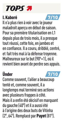 | KABORĂ | 8 | Allez ce but encaissĂ© en fin de match oĂč il tombe devant le troyen ne suffit pas Ă gĂącher un match vraiment rĂ©ussi. Il a enchaĂźnĂ© les aller-retours, a Ă©tĂ© juste techniquement et plutĂŽt bon dĂ©fensivement. Lâun des hommes fort du soir. |