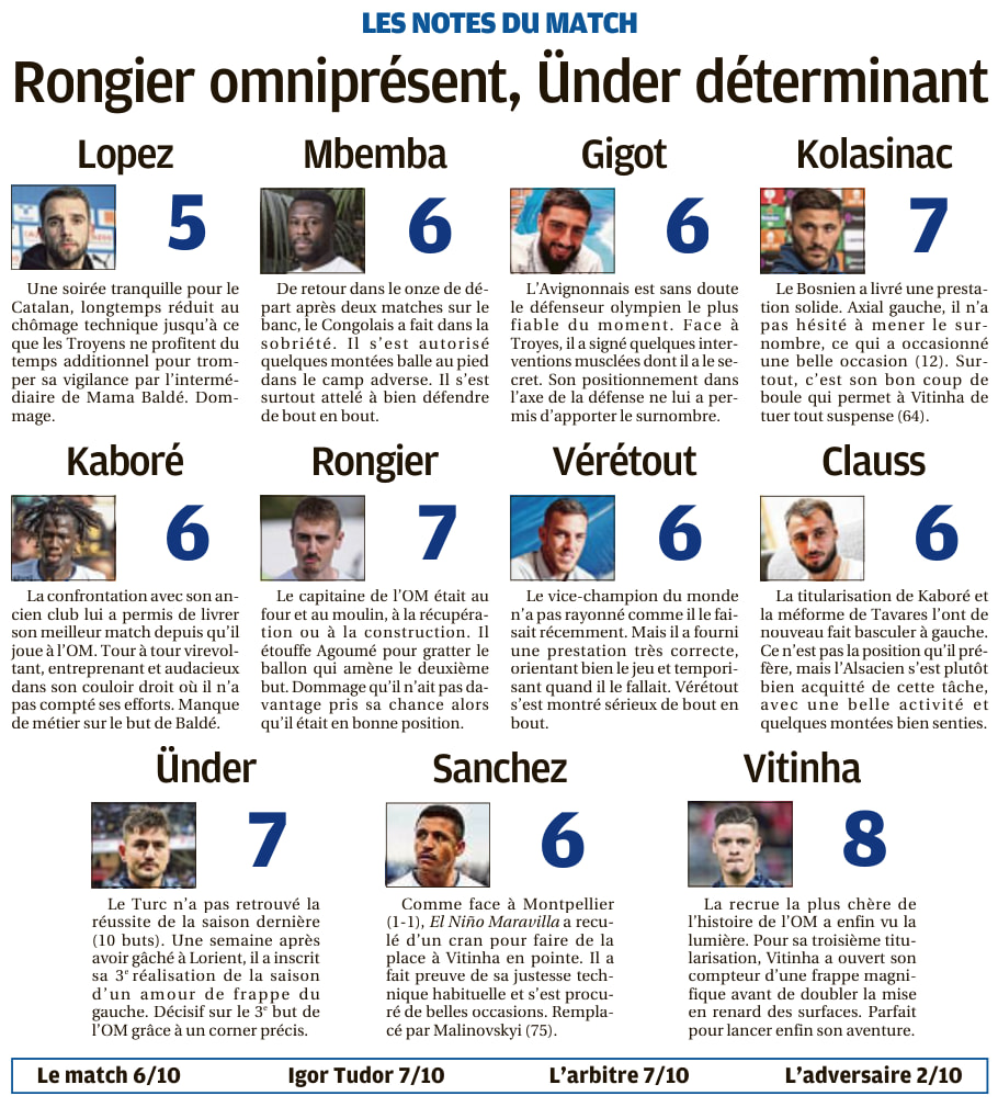 | RONGIER | 8 | Si lâOM a Ă©tĂ© aussi bon sur les seconds ballons câest beaucoup grĂące Ă lui, il a Ă©tĂ© dans beaucoup de bons coups, rĂ©cupĂšre Ă©normĂ©ment de ballons, est juste avec le ballon. Dommage quâil hĂ©site tant Ă tirer⊠|