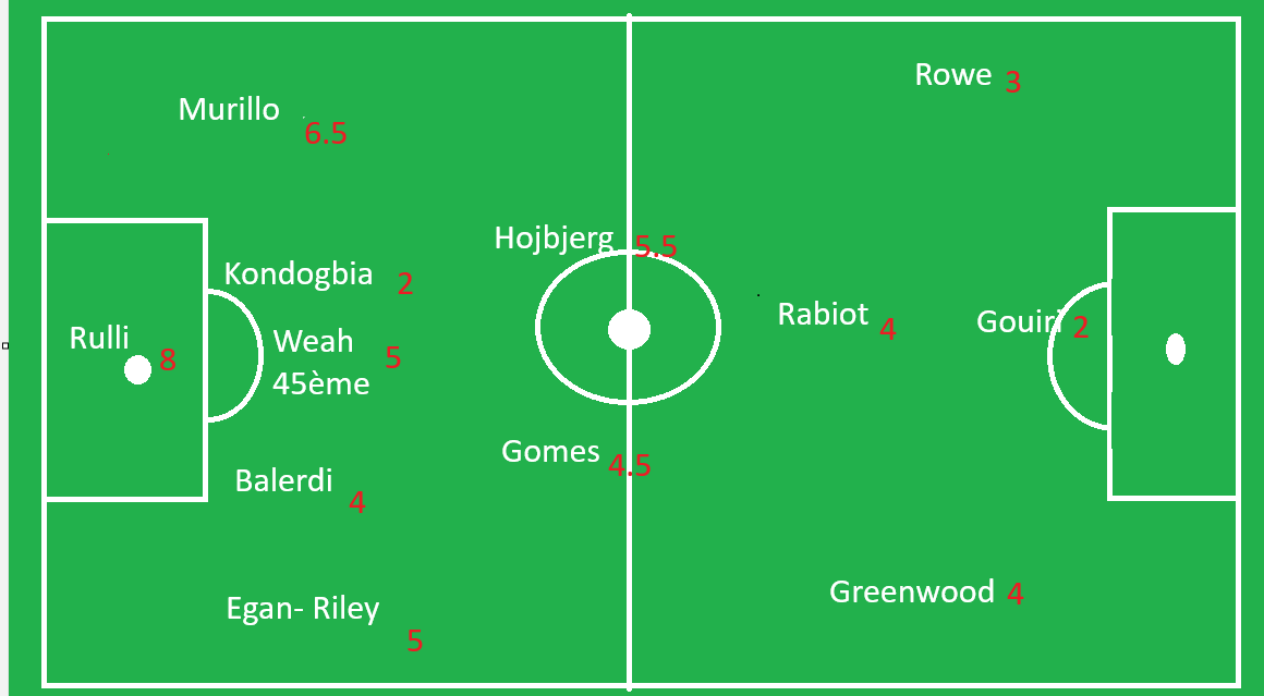| GREENWOOD | 5 | De bonnes transversales et quelques frissons balle au pied, câest sa provocation qui permet de trouver Rabiot pour le poteau mais il a perdu pas mal de duels et il a forcĂ© quelques actions ou finit certaines passes avec une grosse nonchalance. Notamment ses CPA, trĂšs mauvais. |
