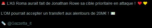 De ce qui fuite un peu, Rowe pourrait/devrait partir dâici Ă la fin du WE (Rennes dessus, des clubs de PL aussi et un club Turc).