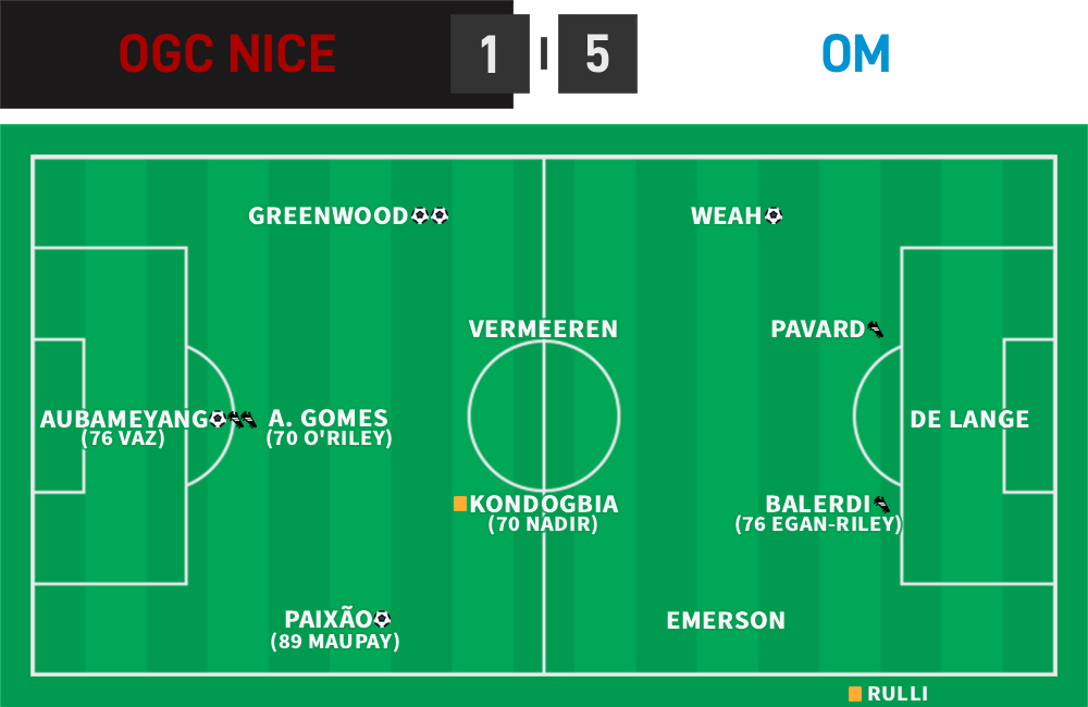 | GREENWOOD | 9 | Double buteur, dangereux Ă chaque instant, mais Ă©galement impliquĂ© et bon dans les combinaisons. Un de ses meilleurs matchs Ă lâOM. |