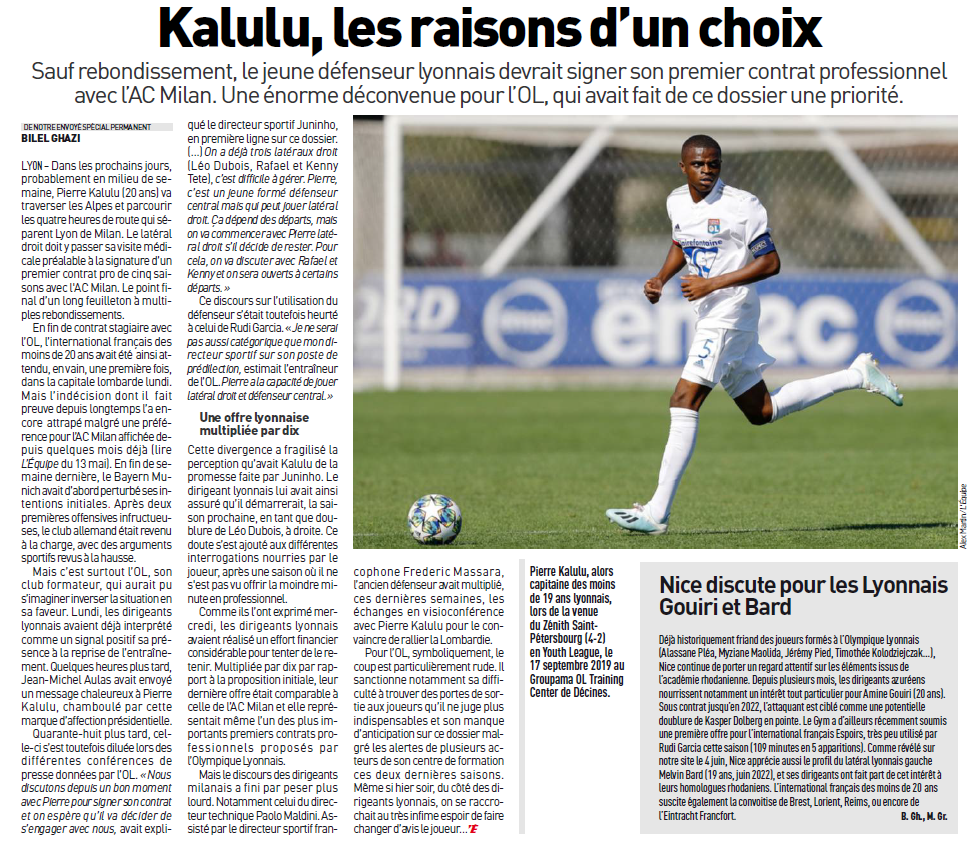 Kalulu : De ce que jâai compris lâOL sâest alignĂ© sur Milan. La principale diffĂ©rence câest le discours des clubs. Dâun cĂŽtĂ© Milan lui promet un role de doublure et du temps de jeu comme latĂ©ral droit si jâai bien suivi. Maldini lâa en contact rĂ©gulier et lâentraineur lâappelle aussi pour le rassurer.