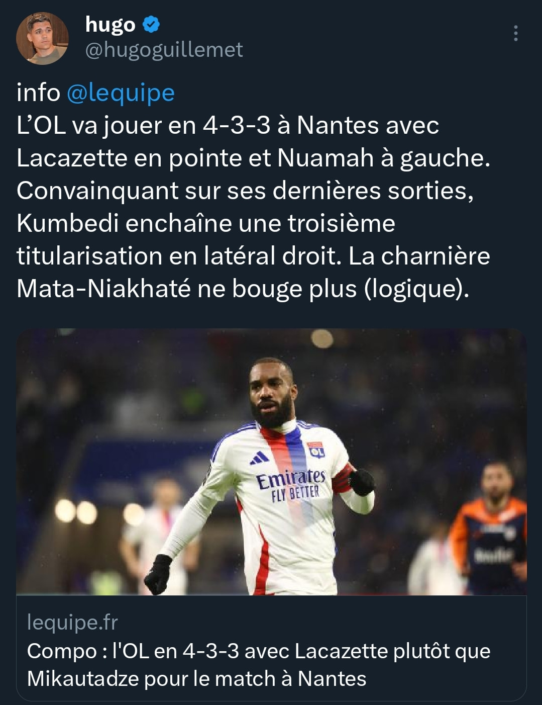 Mais clairement que si Mikautadze sort jâaurai prĂ©fĂ©rĂ© voir un des deux jeunes plutĂŽt que Lacazette repasse devant et revoir le 11 une nouvelle fois changer.