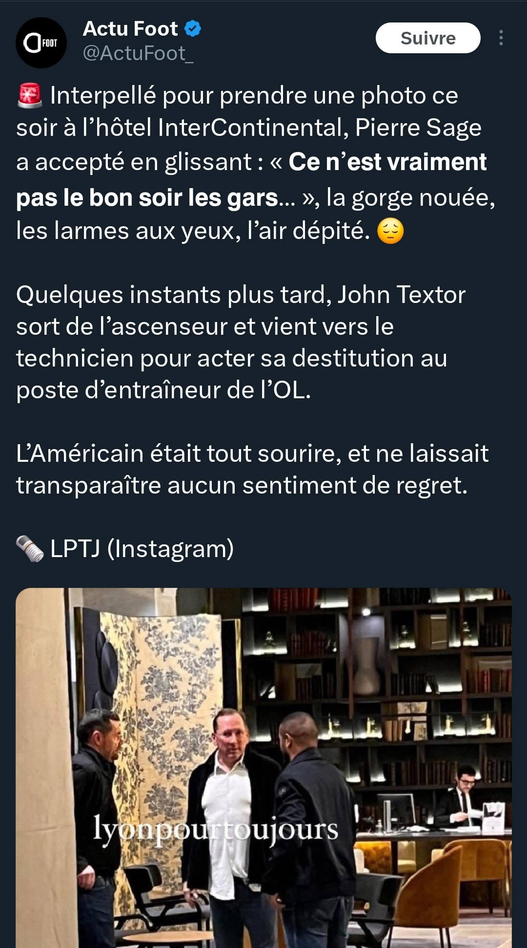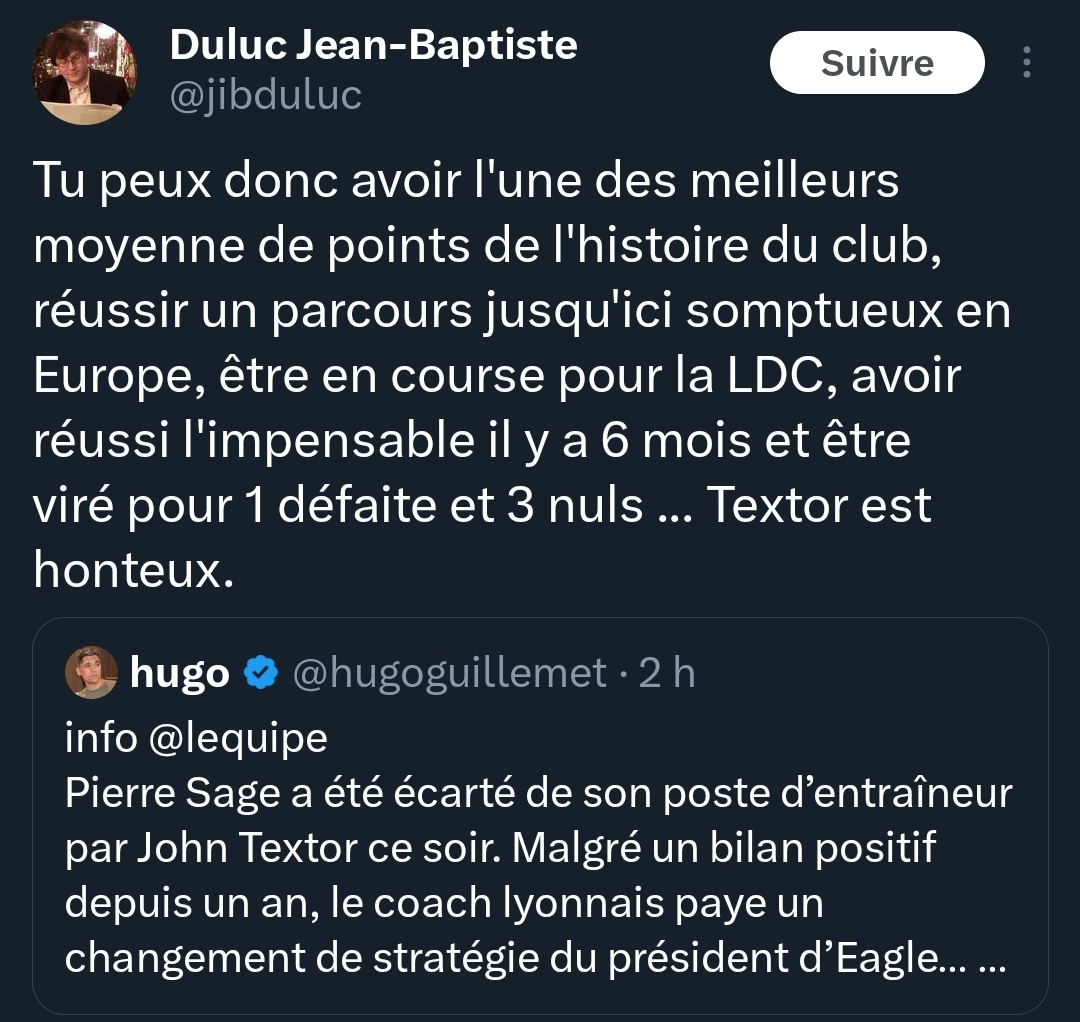 Sachant quâon a appris quelques infos dans lâAfter RMC comme quoi Textor a plusieurs fois fait changer la composition de Sage en avant match pour faire jouer certains joueurs ou modifier certaines choses. DerniĂšrement il mettait une pression dingue et Sage avait carrĂ©ment dit que contre les turcs sâil nâavait pas dĂ» suivre certaines consignes il aurait jouĂ© sĂ»rement diffĂ©remment. AprĂšs le match de Nantes il disait que la saison passĂ©e on a Ă©tĂ© qualifiĂ© mĂȘme pas 10 mins en Europa dans la saison et ça avait suffit⊠Textor nâen nâaura fait quâĂ sa tĂȘte sur tous les points.