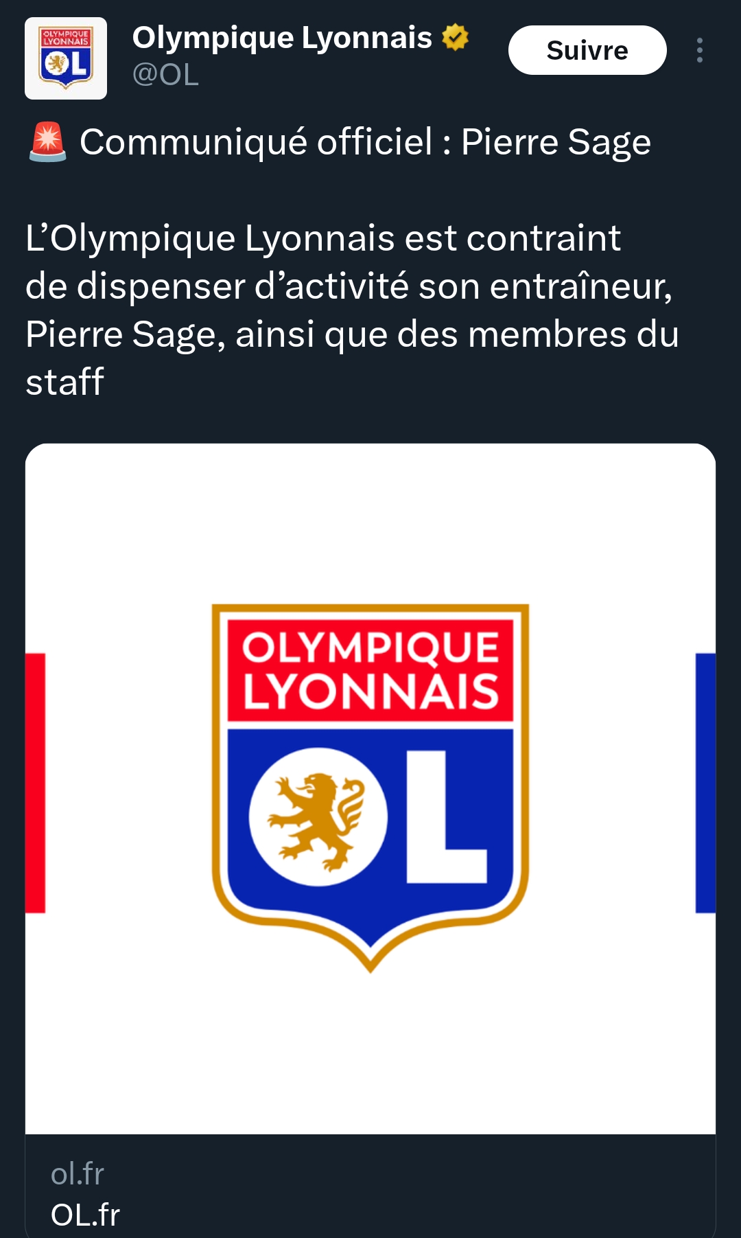 « LâOlympique Lyonnais est contraint de dispenser dâactivitĂ© son entraĂźneur, Pierre Sage, ainsi que les membres du staff, Jamal Alioui, Rui Lemos, Denis Valour et RĂ©my Vercoutre, dans lâattente dâune dĂ©cision Ă venir dans les prochains jours. »