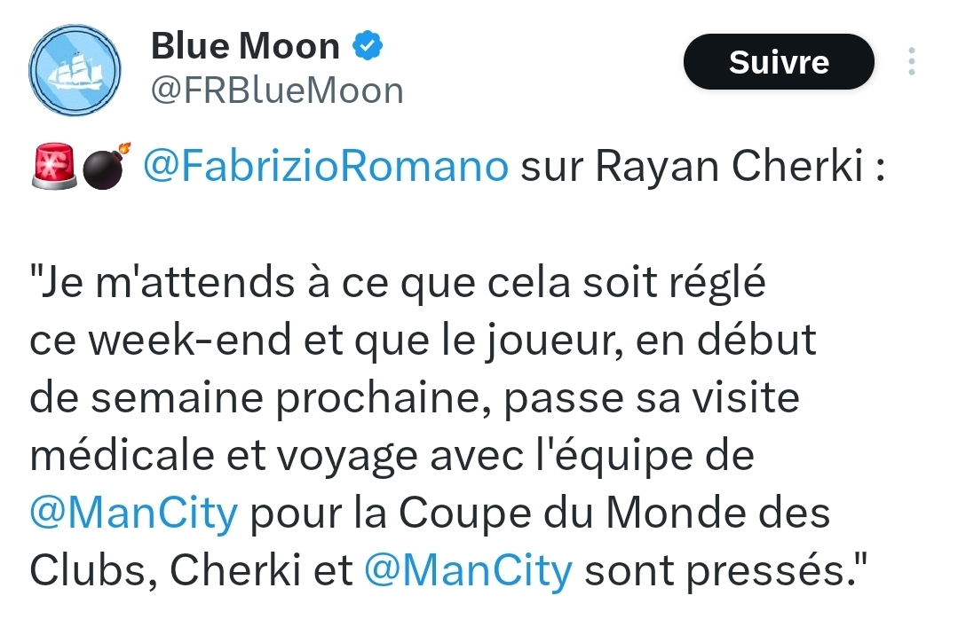 Textor va accepter le plus offrant. LĂ oĂč Man City joue au con depuis plusieurs jours et les concurrents sur le dossier doivent ĂȘtre proches de tout ça. En plus contre lâAllemagne DembelĂ© et Barcola sont forfaits, si Cherki commence et lĂąche un gros match, ça peut vite sâenflammer avant la CDM des clubs.