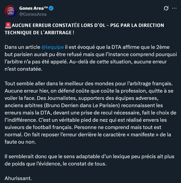 Mais jâai aimĂ© le fond du message sur le manque de cohĂ©rence et aussi le fait que les arbitres refusent toutes explications ou le moindre contact !