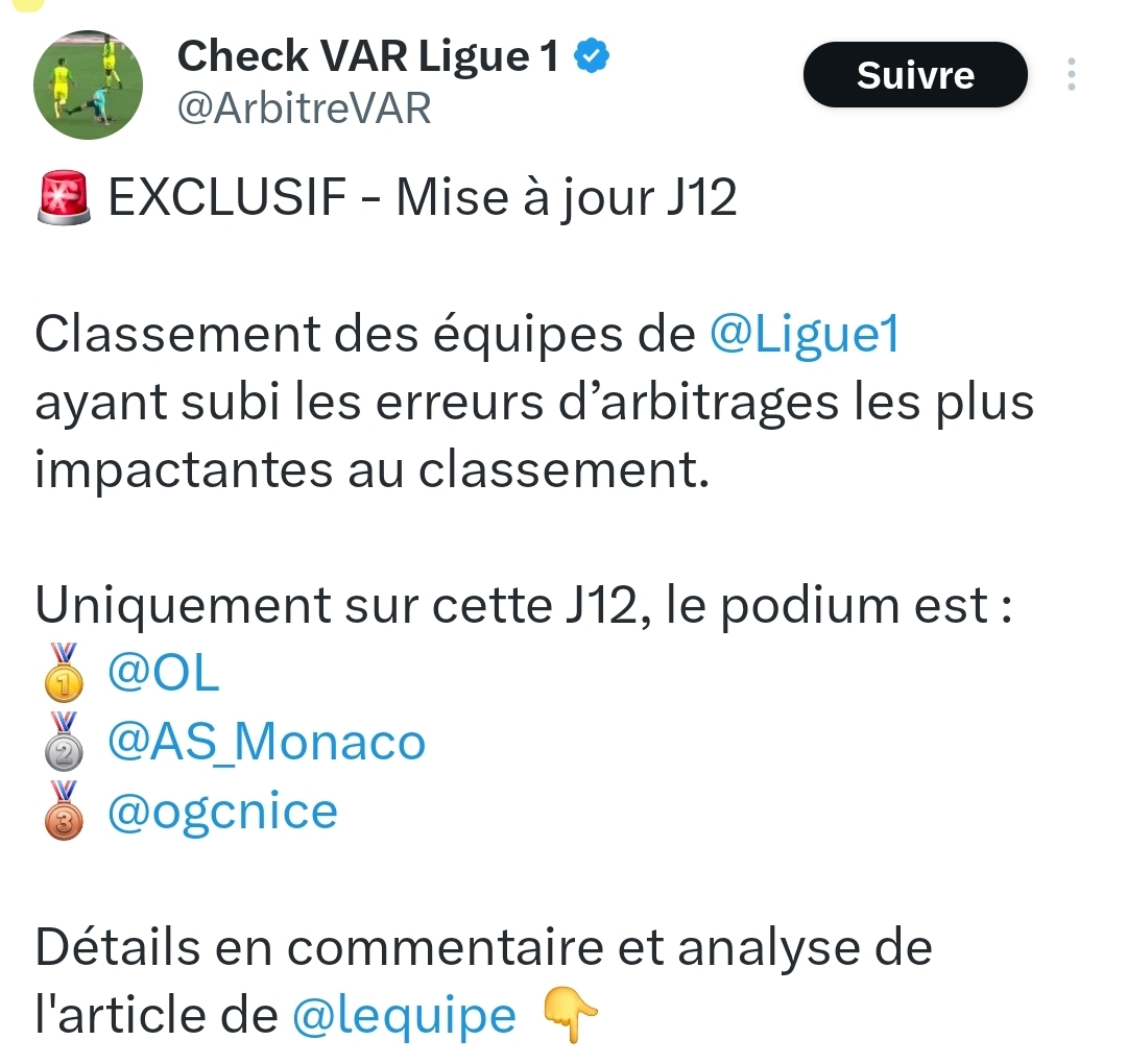 "Classement des Ă©quipes de Ligue 1 ayant subi les erreurs dâarbitrages les plus impactantes au classement", selon qui ? Genre pour OL - PSG si la direction de lâarbitrage nâa constatĂ© aucune erreur, est-ce que ce compte en comptabilise tout de mĂȘme ? MĂȘme en dehors des deux clubs concernĂ©s les gens sont rarement unanimes concernant des Ă©ventuels erreurs.