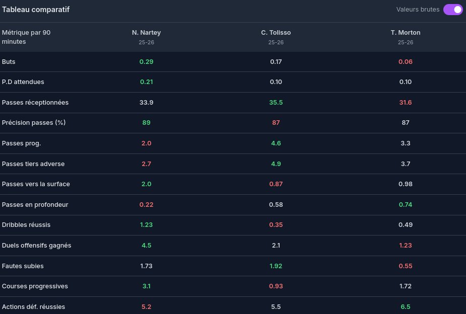 En soit en a dĂ©jĂ fait partir Barisic. Quelques autres indĂ©sirables du groupe pourrait suivre sans poser de souci ni au onze, ni Ă la rotation. Si Mangala revient bien ça valeur peut remonter trĂšs vite vu son profil. Et le club va profiter de celle haute de Tessmann pour sâen dĂ©barrasser si grosse offre (il Ă©tait surement en sur-performance vu ce quâil montre derniĂšrement). Si on signe Nartey câest clairement que Tessmann + De Carvalho vont bouger. Sinon offensivement il faudra voir parce que Moreira est sur une trĂšs bonne forme et peut jouer sa place, Ă voir quand Fofana & Nuamah reviendront de blessure parce quâil mĂ©rite de rester dans le onze.
