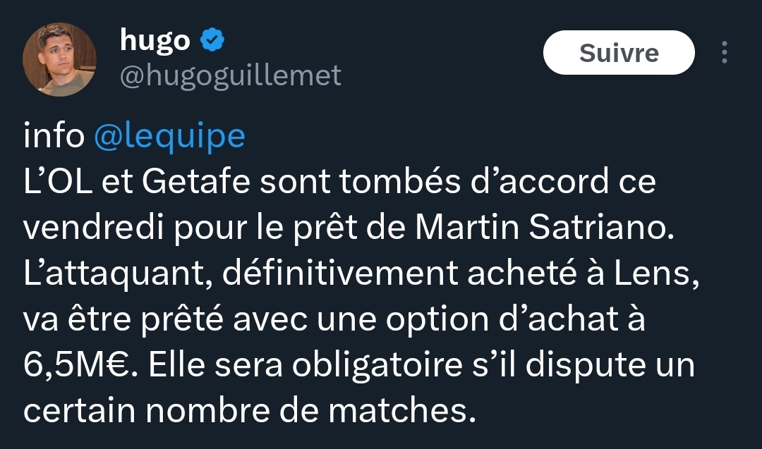 LâOL vient de lĂącher le communiquĂ© officiel. En gros le club avait payĂ© 1M⏠pour son prĂȘt et avait une OA de 5MâŹ. Ils ont aujourdâhui confirmĂ© lâavoir levĂ© (donc au total il aura coĂ»tĂ© 6M⏠@Revizor). Et le club vient dâannoncer en mĂȘme temps quâil est prĂȘtĂ© Ă Getafe, le prĂȘt nâest pas payant mais pourrait le devenir pour 300K⏠selon les conditions. Et il y a une OA de 6.5M⏠obligatoire sâil atteint un certain nombre de matchs jouĂ©s.