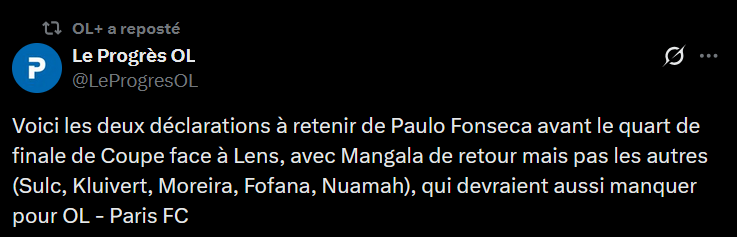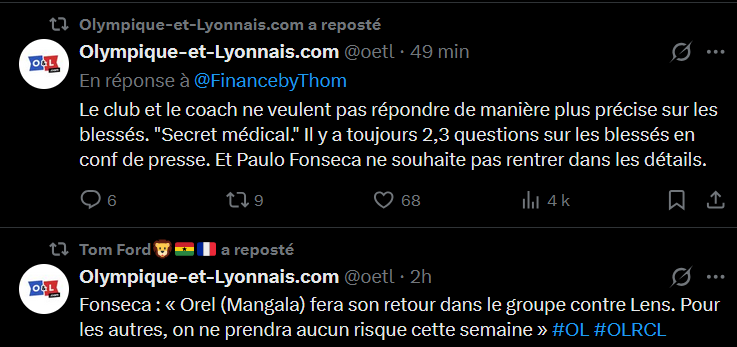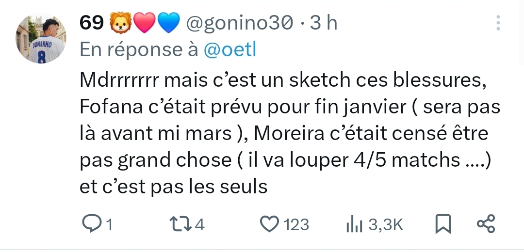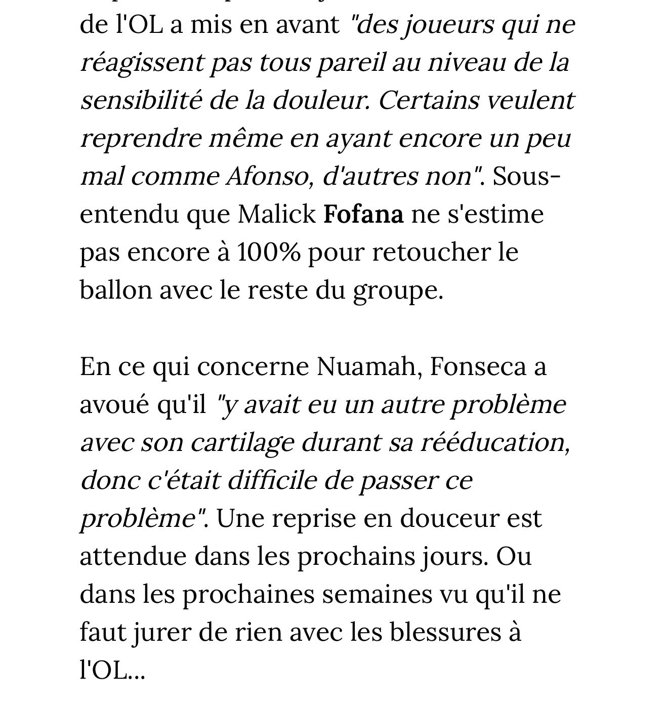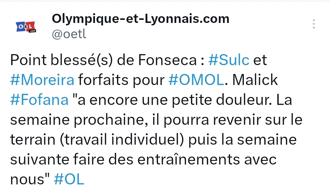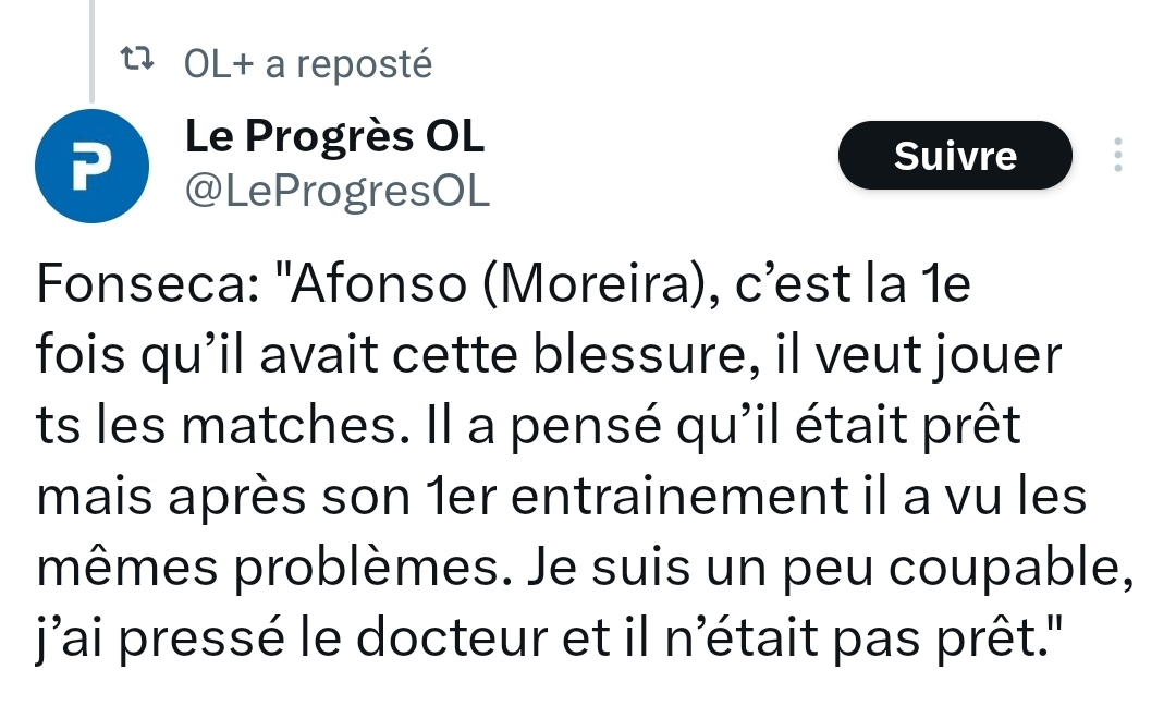 Câest quand mĂȘme bien bizarre tout ça. Sachant que rĂ©cemment Abner et Tagliafico avaient avouĂ© avoir jouĂ© en Ă©tant blessĂ© sur la premiĂšre partie de saison par manque de choix. CĂŽtĂ© supporters & journalistes ça commence Ă se poser des questions sur la gestion de certains joueurs. ![]()