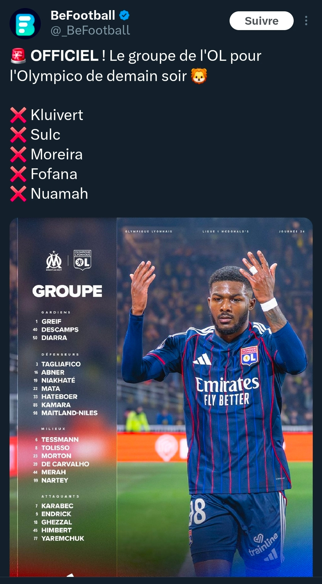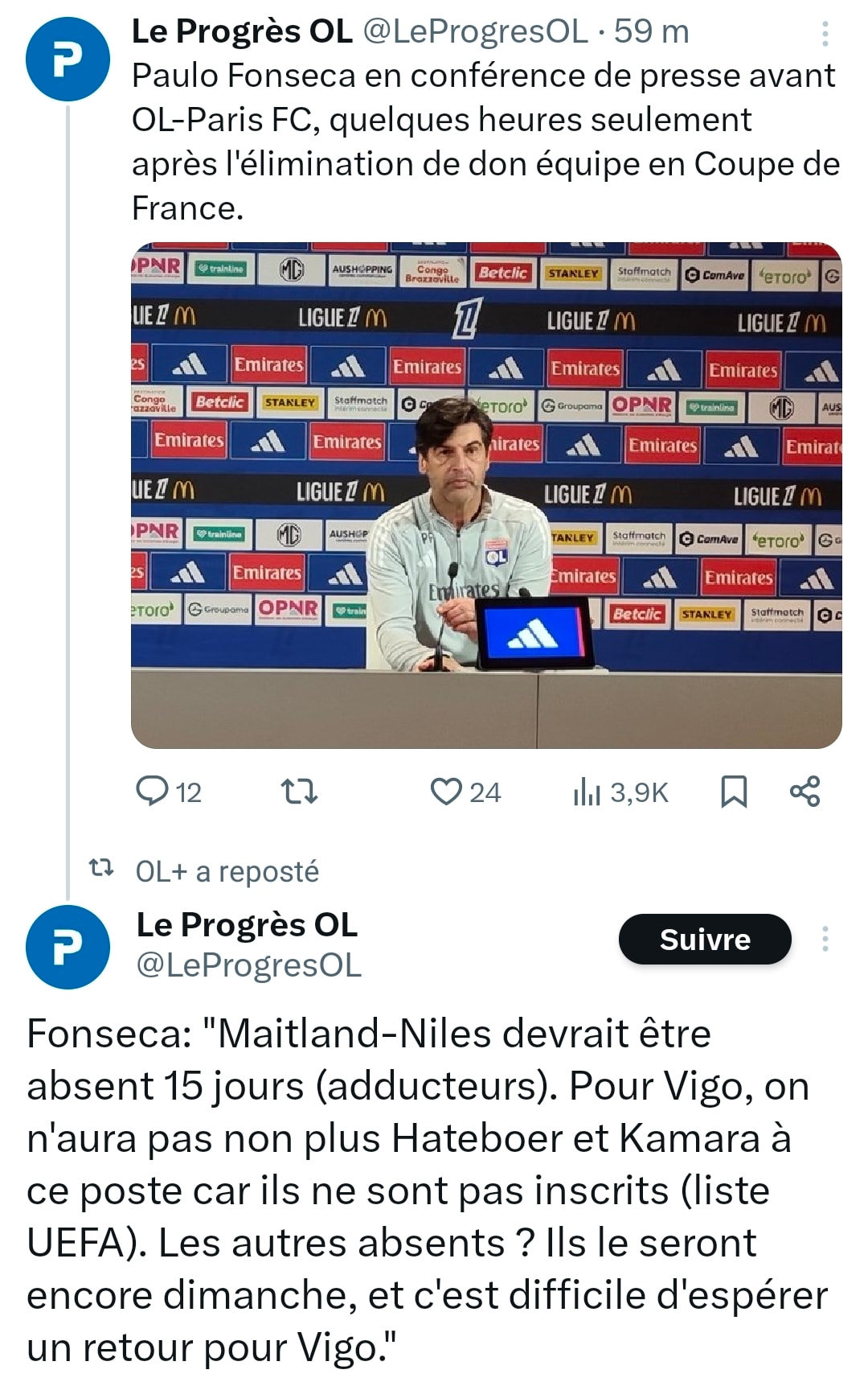 Sachant quâon ne devrait pas rĂ©cupĂ©rer de blesser pour le match de Lens qui sâannonce ultra chaud vu les absences. On pourrait espĂšrer un retour de Moreira et Kluivert pour celui du Paris FC. Rien que les deux pourraient vraiment faire beaucoup de bien vu leurs grosses formes dâavant blessures. Pour Fofana et Sulç je pense quâil faudra encore quelques semaines, comme Nuamah. Ăa reste quand mĂȘme problĂ©matique vu les manques dans le onze, mais il faudrait au moins un retour rapide des 2 premiers. Sulç ça fait mal aussi !
