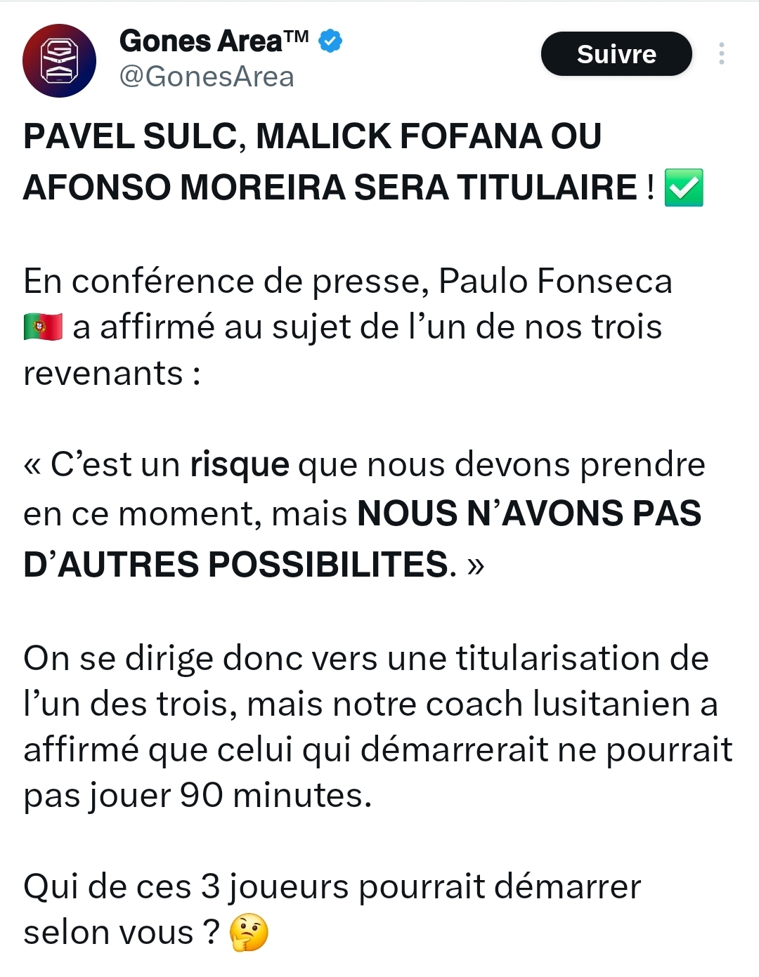 Fonseca a dit en confĂ©rence dâaprĂšs match que Fofana nâa quasi pas jouĂ© parce quâil a ressenti des douleurs aprĂšs son entrĂ©e vs le Celta et Yaremchuk sâest blessĂ© au tendon. Le principal de cette trĂȘve (malgrĂ© les nombreux sĂ©lectionnĂ©s) sera de rĂ©cupĂ©rer le plus de joueurs possible ! On lâa vu aujourdâhui quâavec Sulç et Moreira ça change clairement tout. Si on reproduit un match comme celui quâon vient de faire contre Monaco câest certain quâon sera europĂ©en en fin de saison. Maintenant il va vraiment falloir bosser Ă fond et obligatoirement prendre les 6 pts sur les 2 prochains matchs en jouant Angers et Lorient :