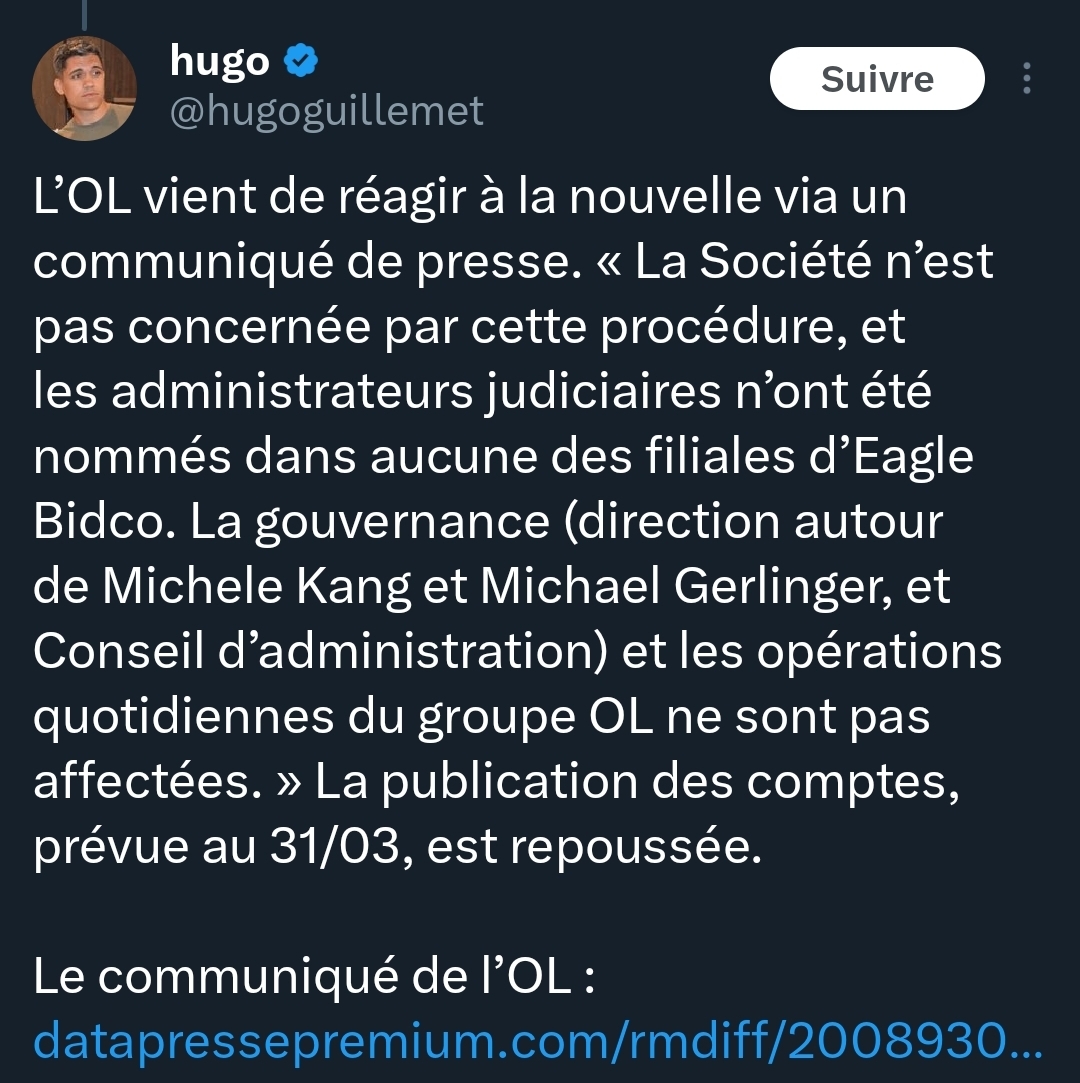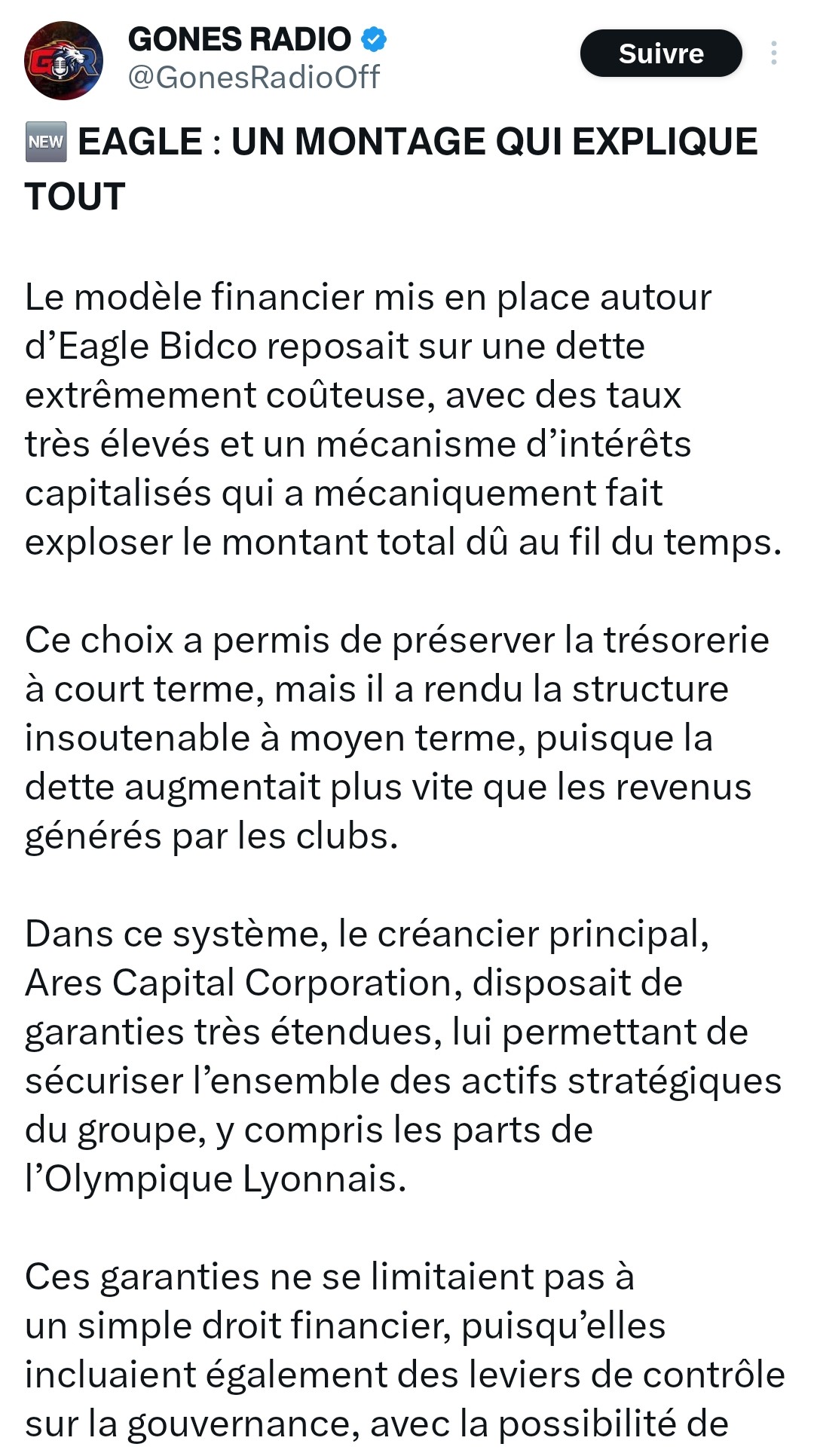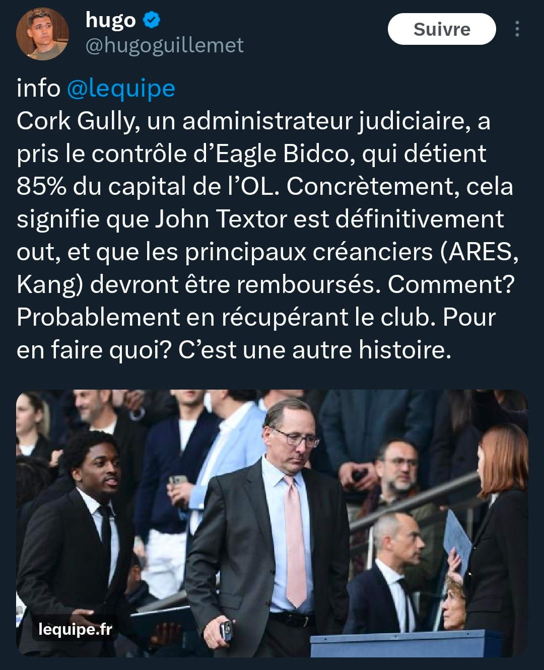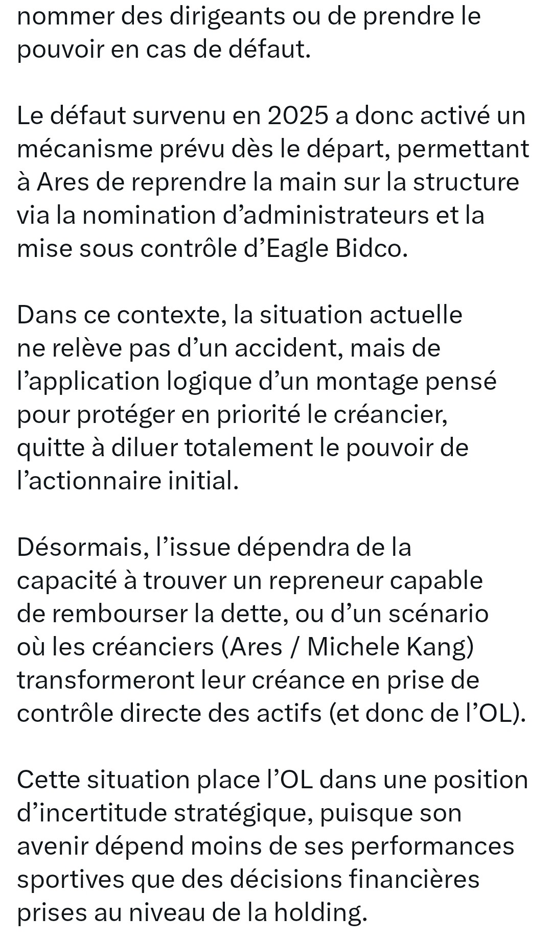 « Les principaux crĂ©anciers de la Bidco Ă©tant ARES et Michele Kang, le scĂ©nario le plus envisageable serait que le fonds dâinvestissement amĂ©ricain et que la femme dâaffaires se remboursent en rĂ©cupĂ©rant le club. Pour en faire quoi ? Câest encore une autre histoire. »