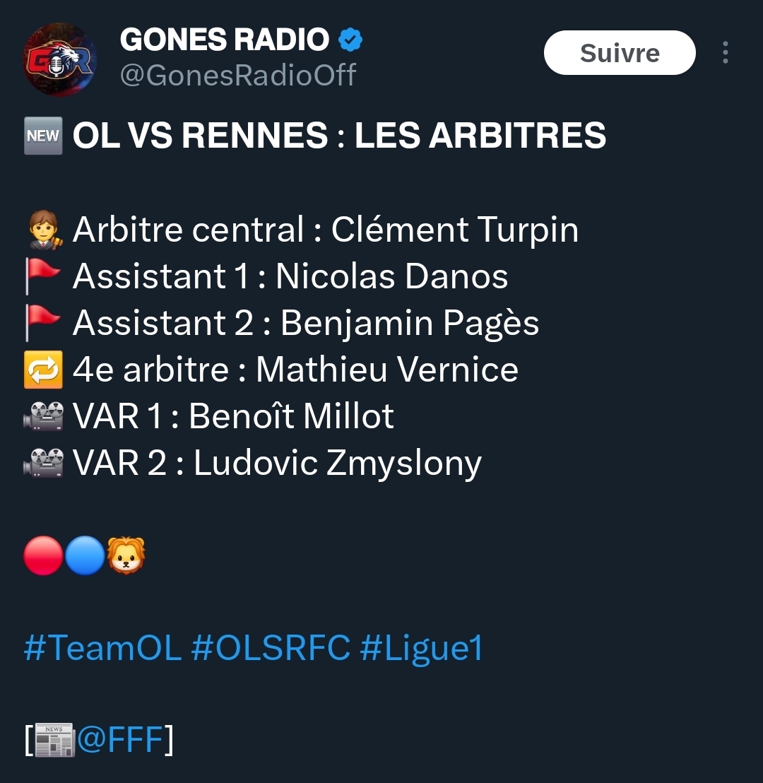 Millot câest le top erreur contre nous via DTA (et le passif du tĂȘte Ă tĂȘte avec Fonseca), Turpin câest le mec qui nous donne de loin le plus de rouges dont certains on se demande encore pourquoi.. et Vernice câest lâexpulsion dâEndrick + la derniĂšre grosse erreur VAR quâon a eu la lâautre fois.. jâespĂšre vraiment que ces clowns nâauront pas dâinfluence sur le rĂ©sultat du match.