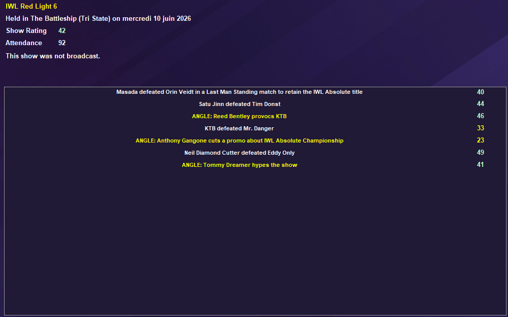 Pour le moment, mon match avec la meilleure note Ă©tait un affrontement entre Neil Diamond Cutter et Eddy Only. Un match simple dâailleurs, sans stipulation. Quant Ă mon meilleur talent de lâannĂ©e 2026, il sâagit de KTB.