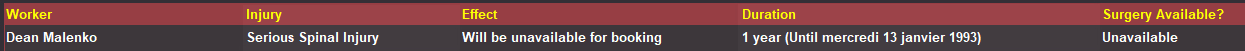 Dans ma partie, jâai recrutĂ© Steven Regal (William Regal) et jâen ai fait mon champion des Etats-Unis. Il se blesse pour 4 mois, je rends le titre vacant et jâen profite pour mettre en avant un autre talent avant son retour. Retour de Regal, il rĂ©cupĂšre le titre et se blesse Ă nouveau, cette fois-ci pour 6 mois. ![]()