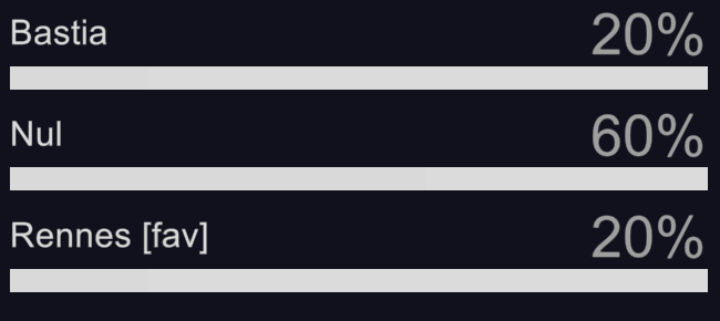Vous étiez 20 % à voir pronostiquer une victoire de Bastia et vous avez raison. Bastia à créé la surprise en battant le Stade Rennais qui est favori 2-1 en infériorité numérique puisque que Brandão à été exclu à la 78 minutes de jeu.