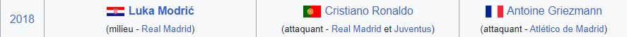 Sauf que les succĂšs espagnol et allemand Ă©taient avant tout collectif. Et 2018 câest un peu bĂȘte comme exemple, Modric le prenant uniquement pour la 2e place croate Ă la CDM.