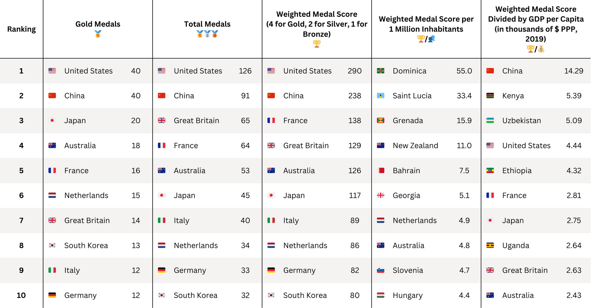 La dernière métrique est un peu daubée, ça compare une variable cumulative (le poids de toutes les médailles) et un taux (PIB par habitant)