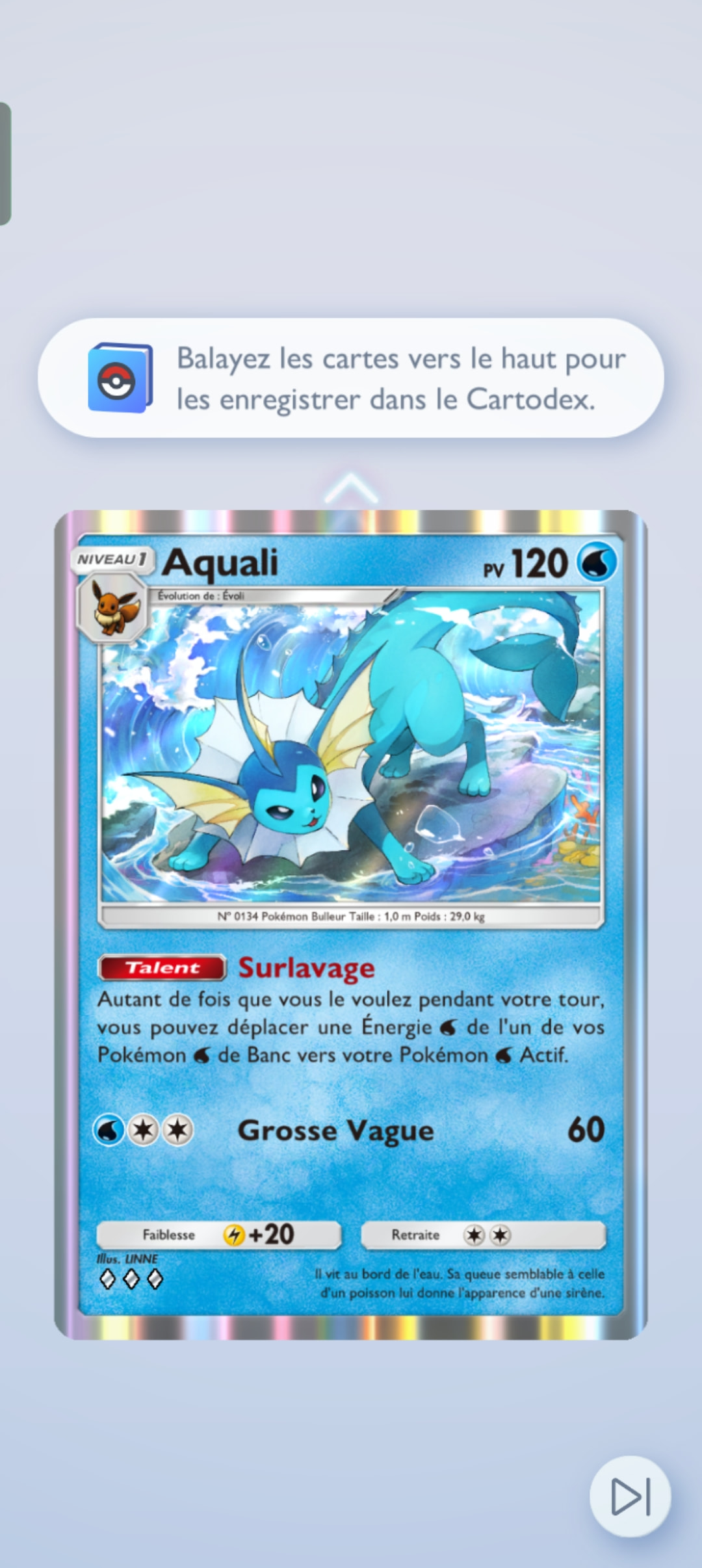 C’est aussi le truc qui me saoule pas mal… j’ai hâte d’avoir accès aux échanges pour compléter mon bilan parce que j’ai pas mal de cartes stylées, en double ou triple, mais à côté de ça je n’ai toujours pas des classiques genre Evoli ou Raichu. ![]()