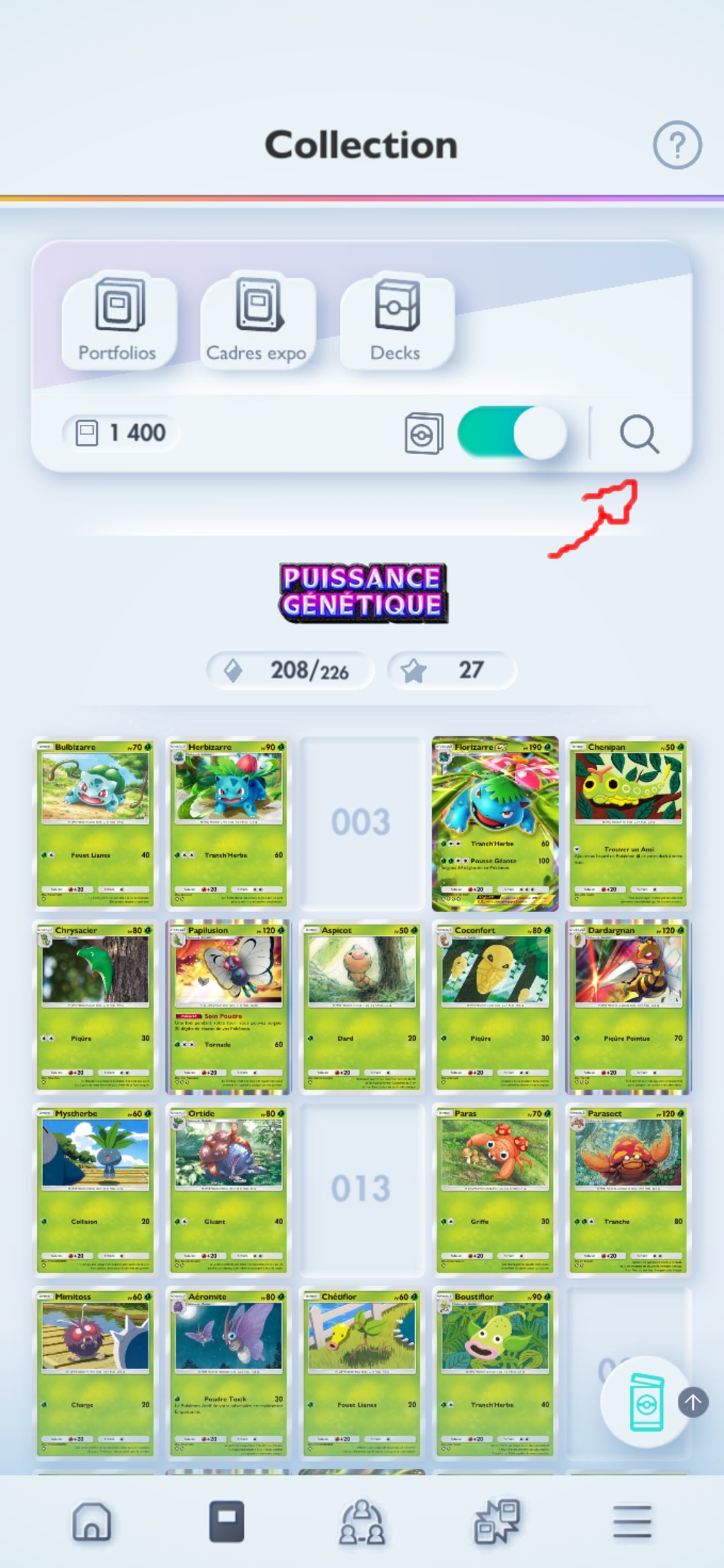 La collection avance bien, il me manque 40 cartes sur Puissance Génétique (j’ouvre pas de booster en ce moment que des pioches miracles) et 8 cartes de l’île Fabuleuse (ouverture de booster en masse)