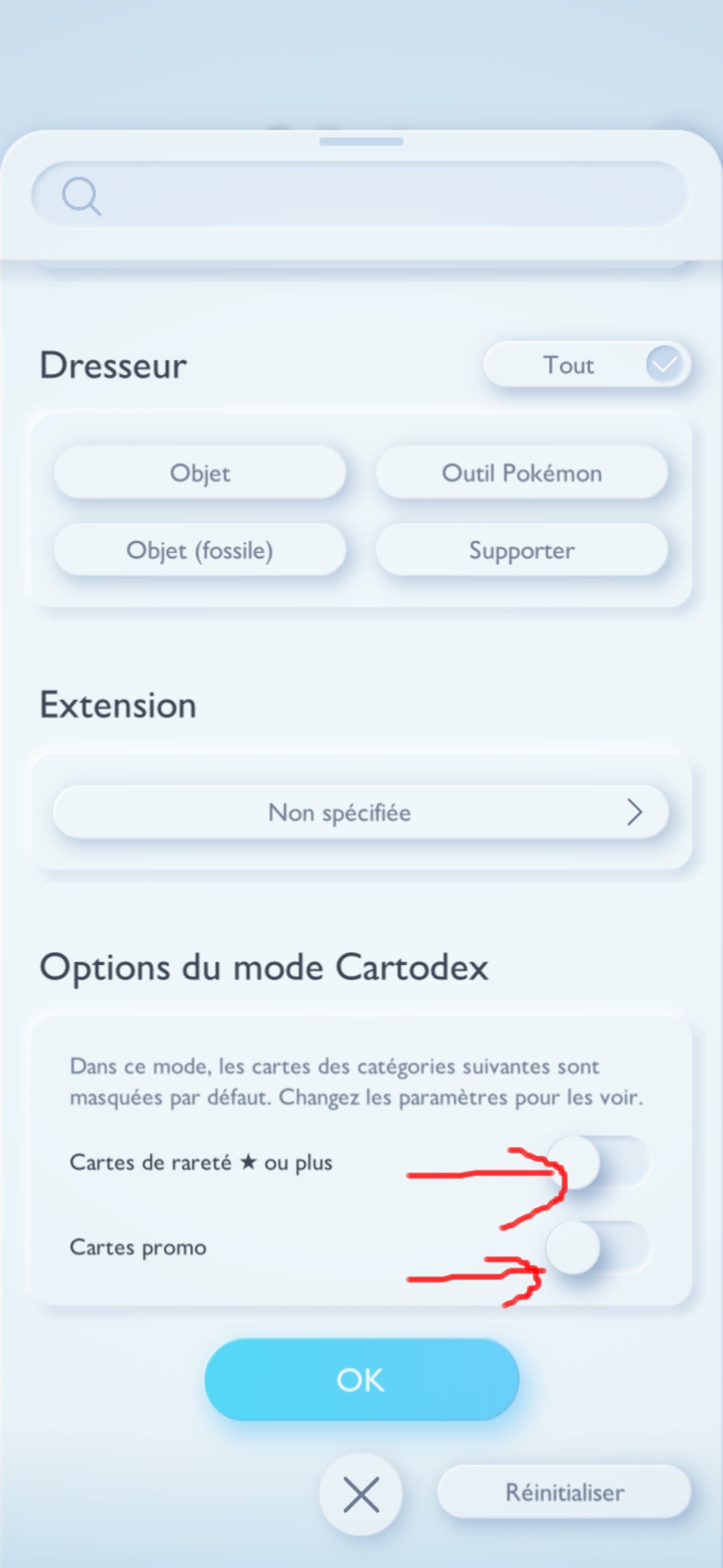 Il faut aller dans tes cartes, activé le mode « collection » → la loupe → cocher les 2 cases du bas.