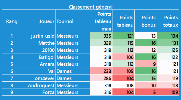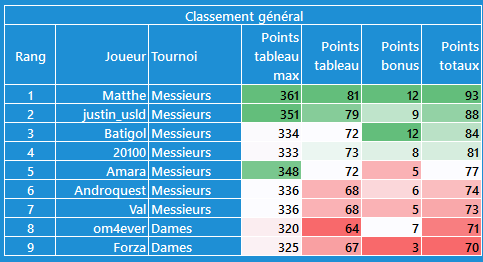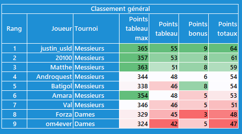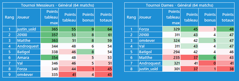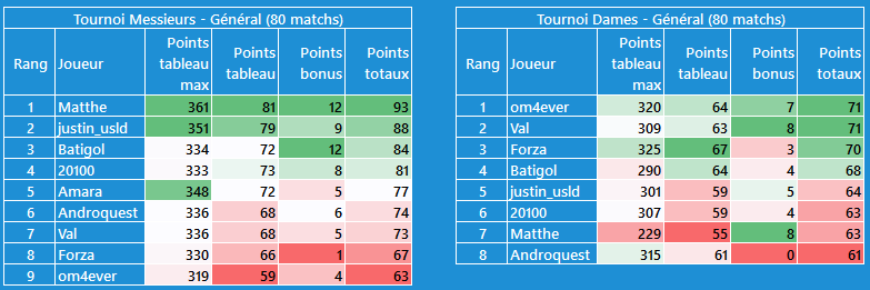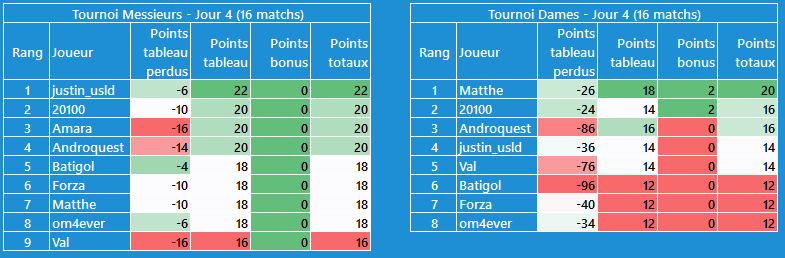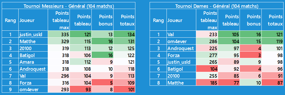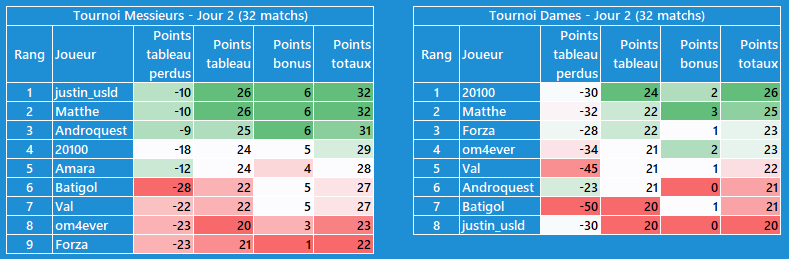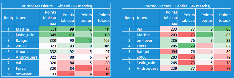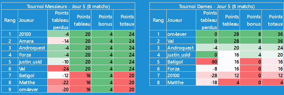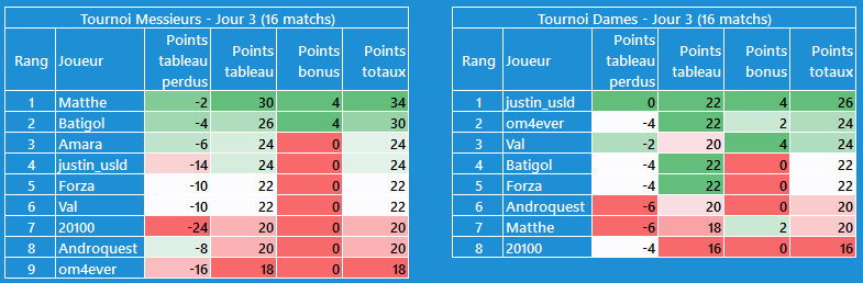 CĂŽtĂ© tournoi dames, moins dâĂ©carts, je suis en tĂȘte avec @Val pour lâinstant, mais les scores sont plus faibles