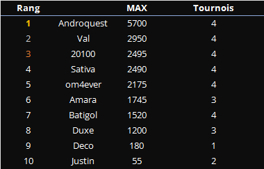 Le vainqueur sera celui ayant à l’issue du tournoi, le score le plus élevé sur l’un des deux tableaux.