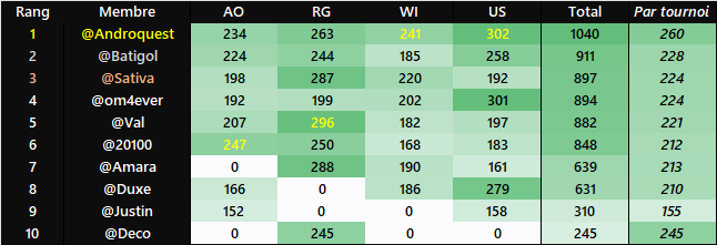 | Open d’Australie | 2025 | @20100 | @Androquest | @Batigol | 247 |