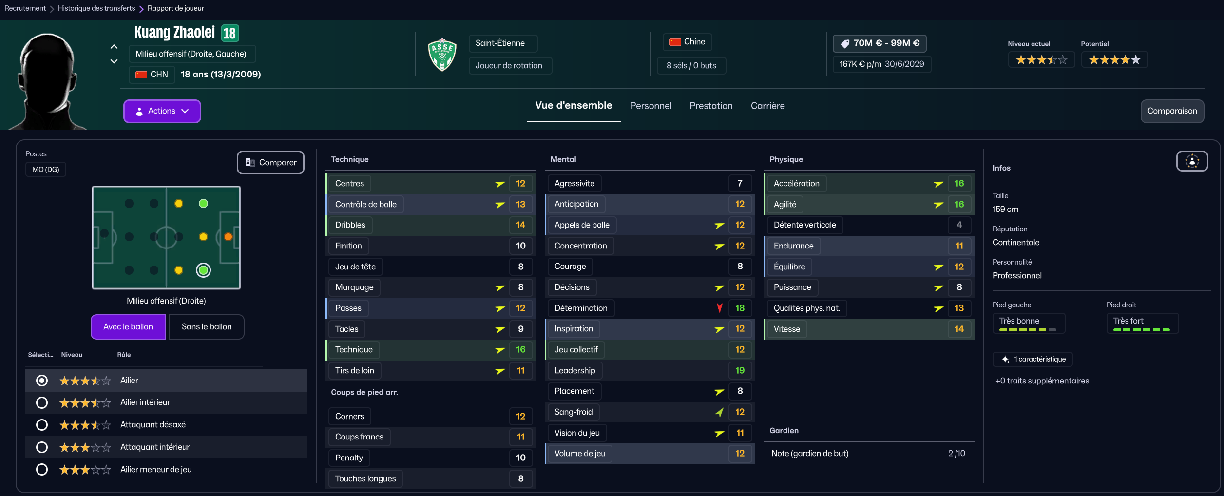 A l’instar de Diouf, j’ai aussi déniché Kuang Zhaolei jeune et prometteur ailier chinois des tréfonds des ligues inférieures espagnoles pour 2m€. Encore en apprentissage, le but étant de le faire rentrer en jeu au max.