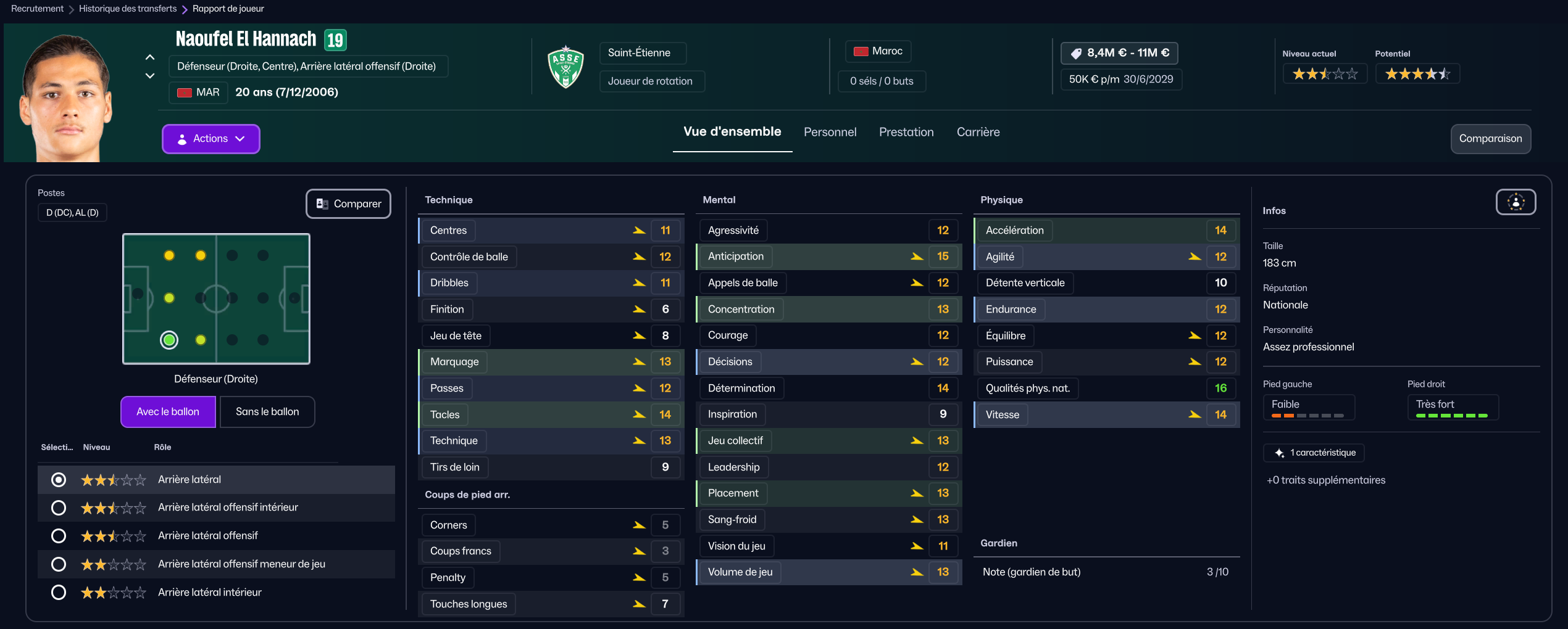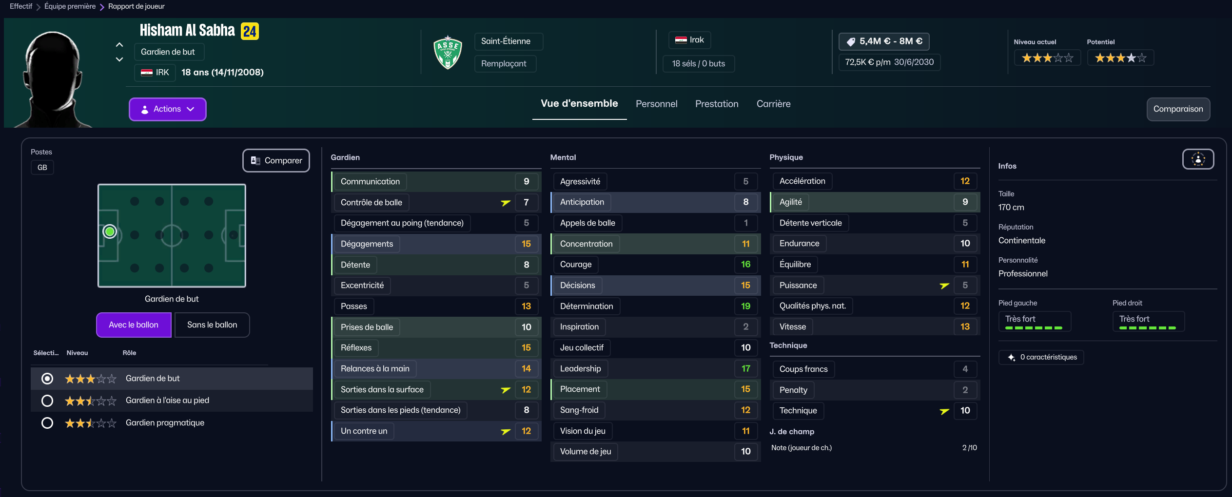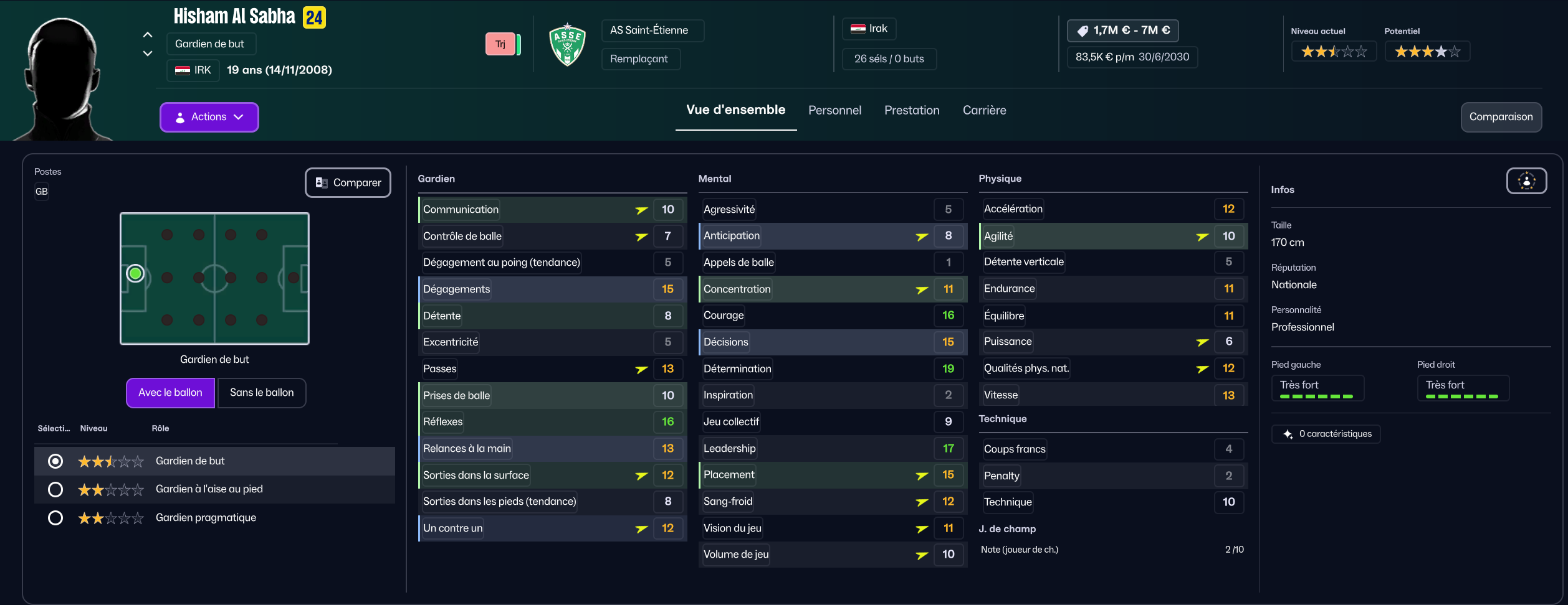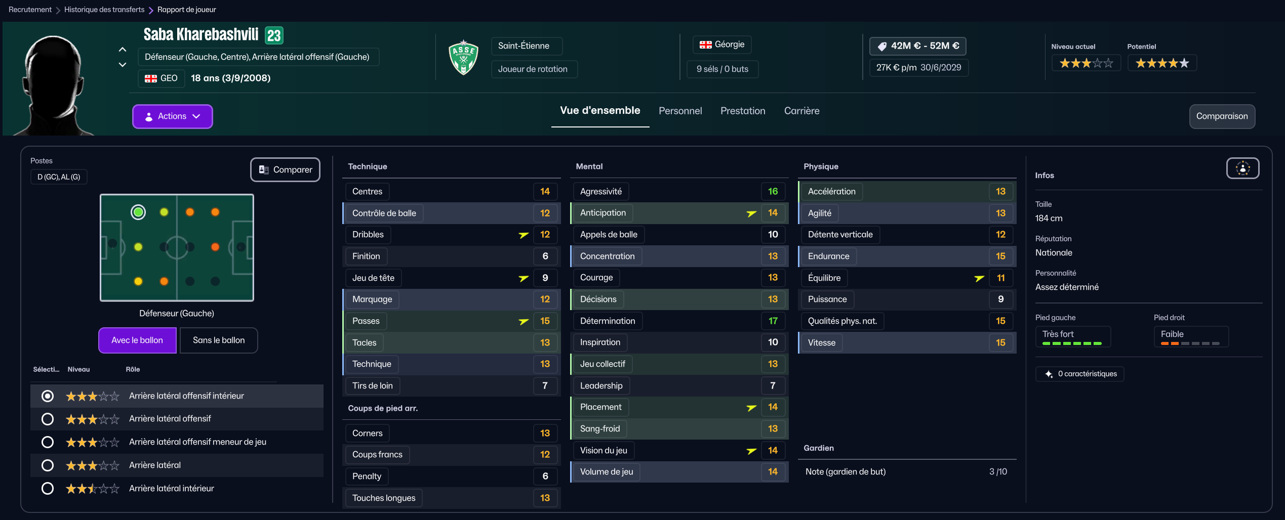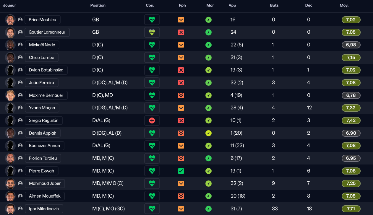 Stojkovic beaucoup trop tendre, il est parti en prêt. J’ai recruté Nafouel El Hannach 500k de la reserve du PSG pour faire tourner un peu. J’ai aussi sauté sur l’occasion de recruter la pépite géorgienne Sareba Kharebashvili de Tbilisi pour 2.7m€ qui est arrivé au mercato d’hiver aussi, pour entrer en rotation.