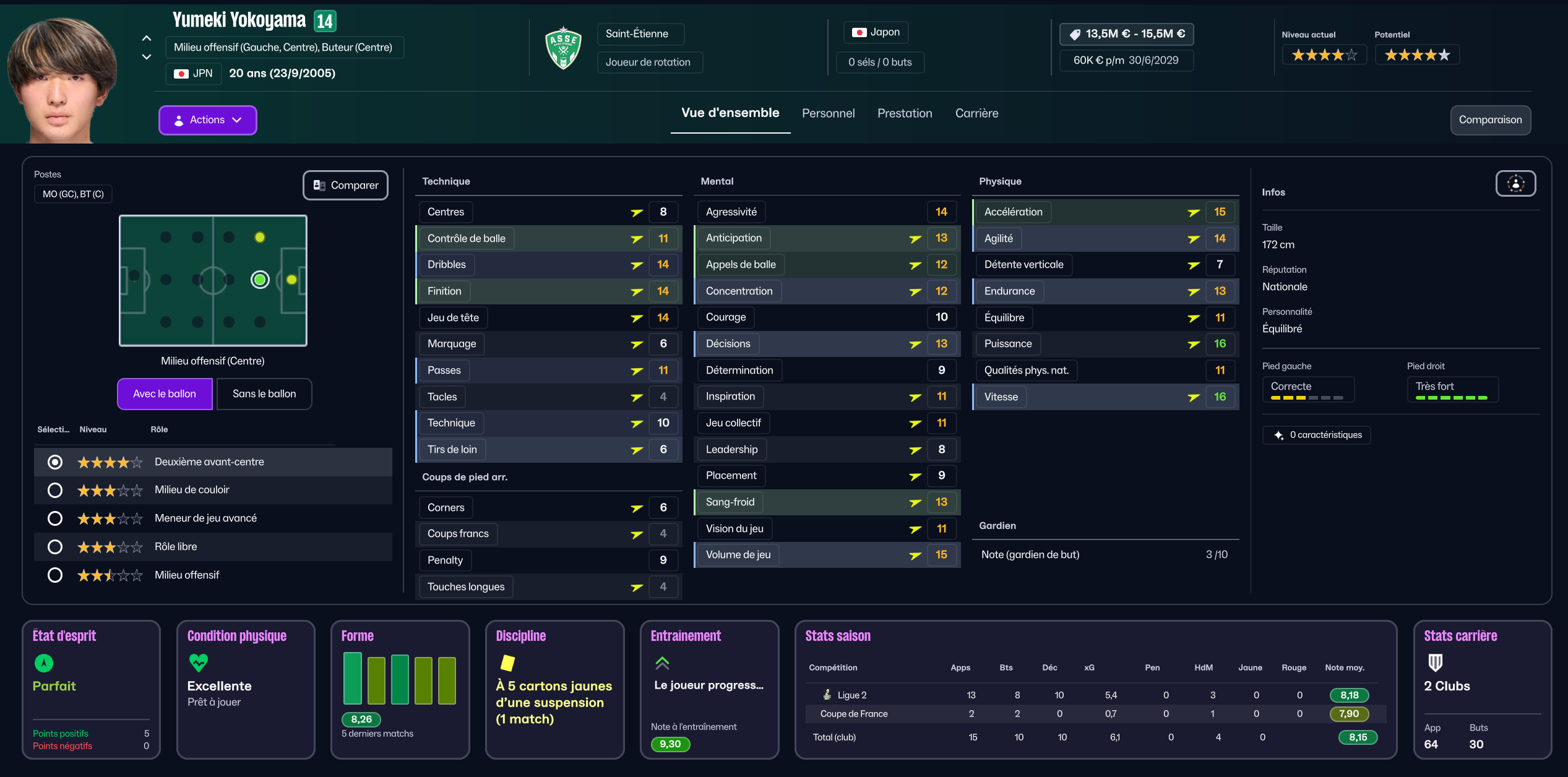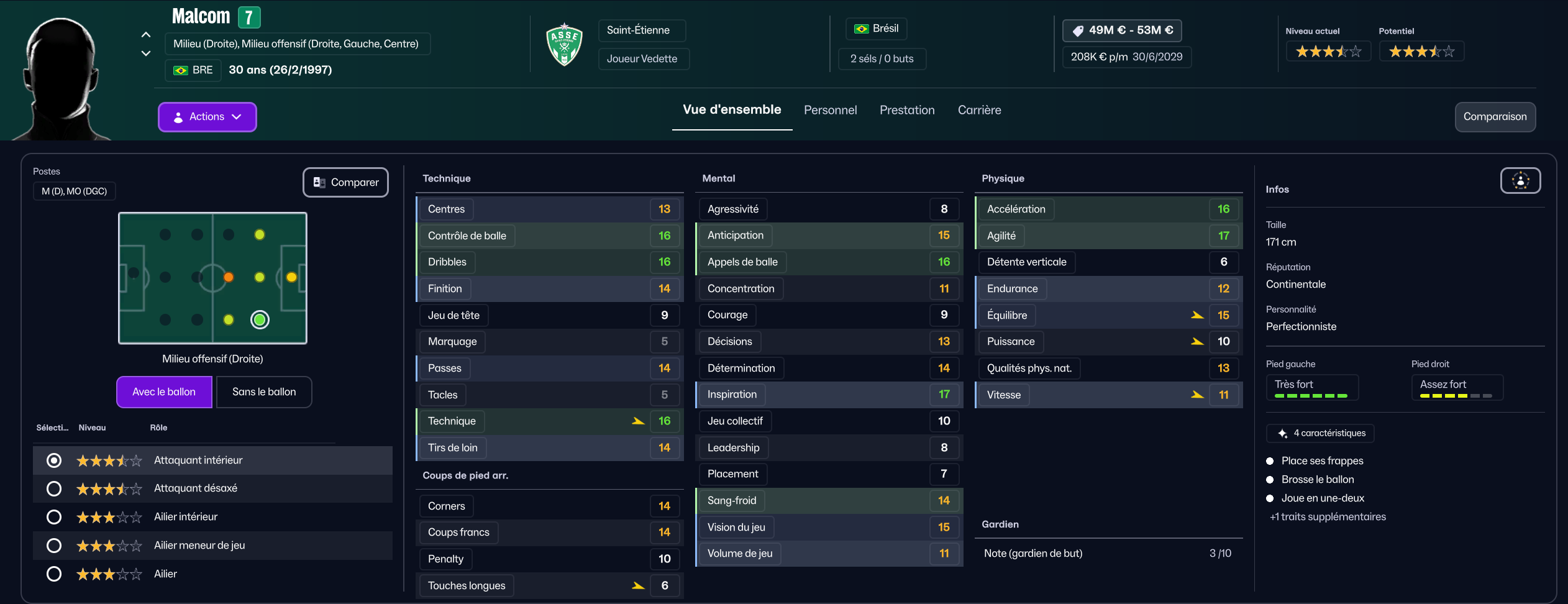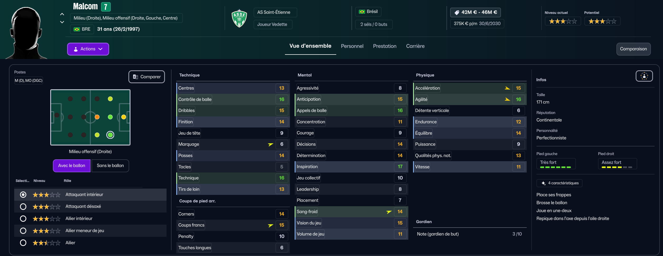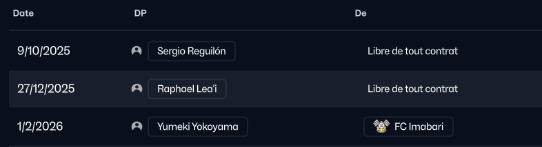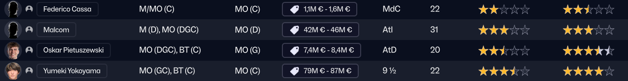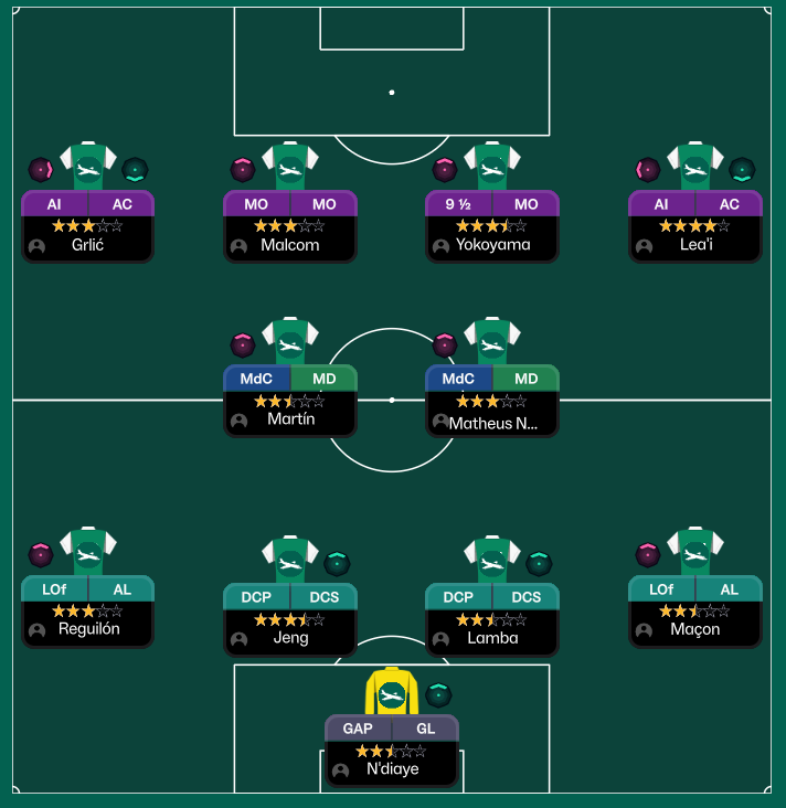 J’ai commencé par une immense chance, recruter l’ex barcelonais Malcom qui était sans contrat, laissé libre par Al-Hilal. Il est arrivé en mars 2026 mais je n’ai pu le qualifier que pour cette seconde saison. Il va etre le pilier offensif central aux côtés de Yokoyama.