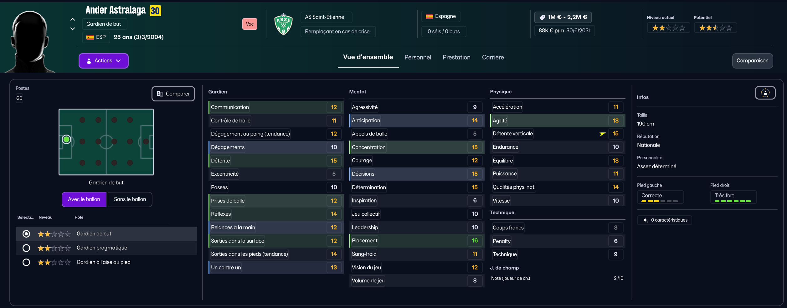 Stojkovic beaucoup trop tendre, il est parti en prêt. J’ai recruté Nafouel El Hannach 500k de la reserve du PSG pour faire tourner un peu. J’ai aussi sauté sur l’occasion de recruter la pépite géorgienne Sareba Kharebashvili de Tbilisi pour 2.7m€ qui est arrivé au mercato d’hiver aussi, pour entrer en rotation.