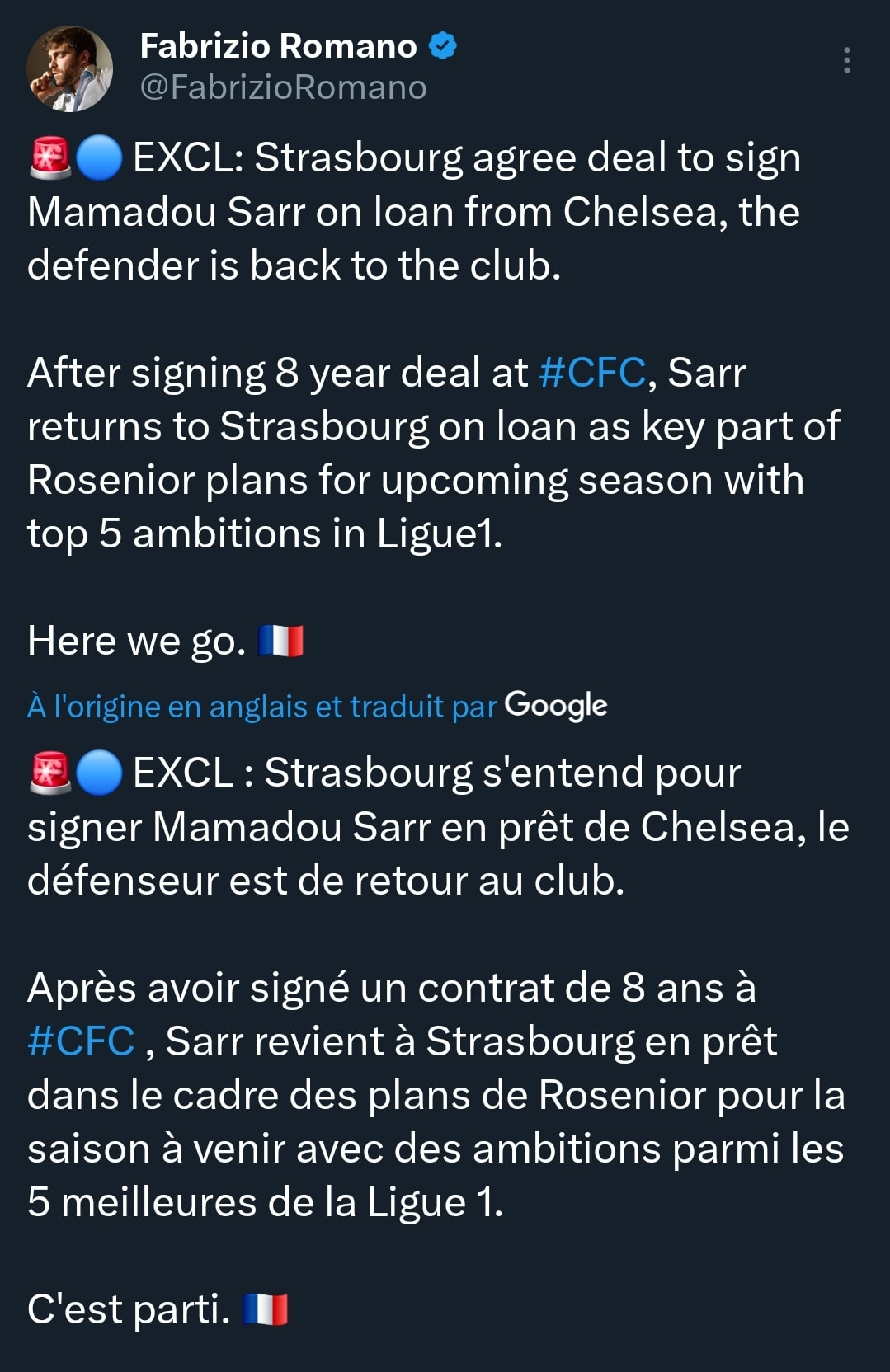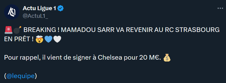 Il est Ă©videmment prĂȘtĂ© par Chelsea, tout comme Mamadou Sarr qui venait dâĂȘtre achetĂ© pour 20MâŹ. ![]()