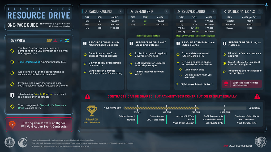 Et pour les joueurs qui ne sont pas au courant, certaines missions de lâevent Ressource Drive sont « buguĂ©es » actuellement, la mission de sauvetage de cargo large offre le maximum de cargo au lieu de 64/100SCU comme il y a encore quelques jours. Non seulement le vaisseau Ă rĂ©cupĂ©rer est ras la gueule (90% de chance que ce soit un M2 Hercules Starlifter avec 400/500SCU) les NPCs ennemis ne sont pas actifs.