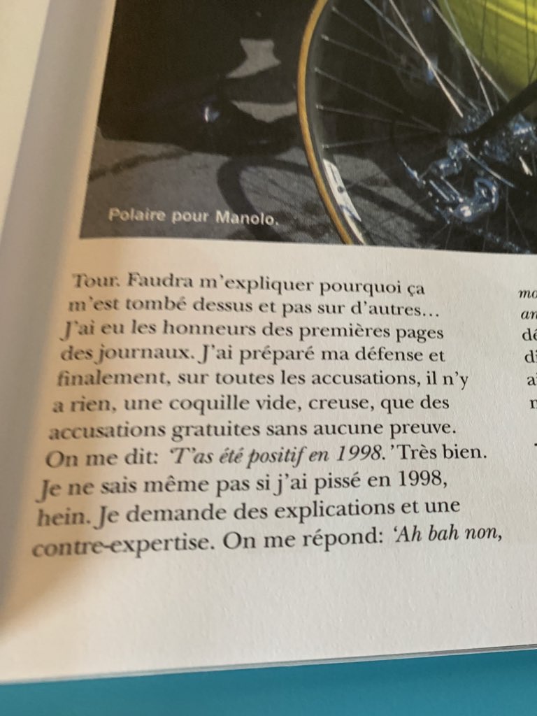 Je vous encourage dâailleurs Ă lire son interview dans So Pedale, oĂč il livre assez clairement quâil nâest pas sur de ne pas avoir Ă©tait dopĂ© Ă son Ă©poque ONCE chez Manolo Saiz, expliquant quâon ne lui disait jamais ce quâil y avait dans les traitements quotidiensâŠ