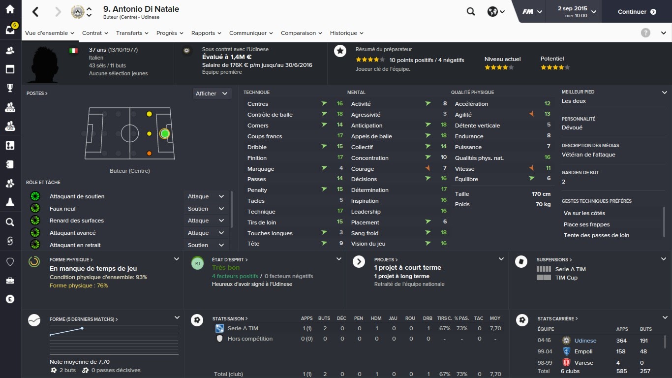 - Antonio Di Natale : J’ai décider de faire revenir la légende du club pour les deux prochaines années, il devra empiler les buts et encadrer nos jeunes attaquants.