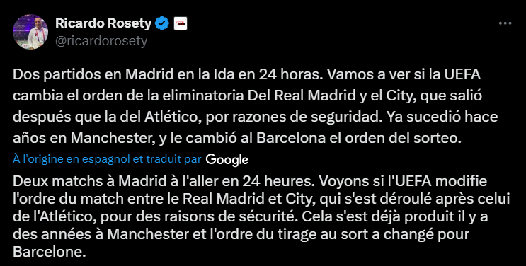Et une phrase Ă double sens « Comme il y a quelques annĂ©es, le Real Madrid pourrait finalement jouer le retour chez lui. » Une phrase qui sonne comme si justement on avait dĂ©jĂ inversĂ© les rencontres il y a quelques annĂ©es Ă cause de ça, ce qui nâest jamais arrivĂ©. Le lien entre cette phrase et le dĂ©but du tweet sâopĂšre tout seul.