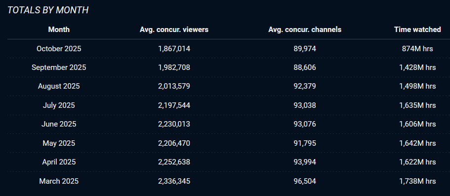Et même mois par mois, 2025 est en chute libre. -20.09 % de spectateurs simultanés sur les 8 derniers mois. 32.84 entre octobre 2025 et octobre 2021.