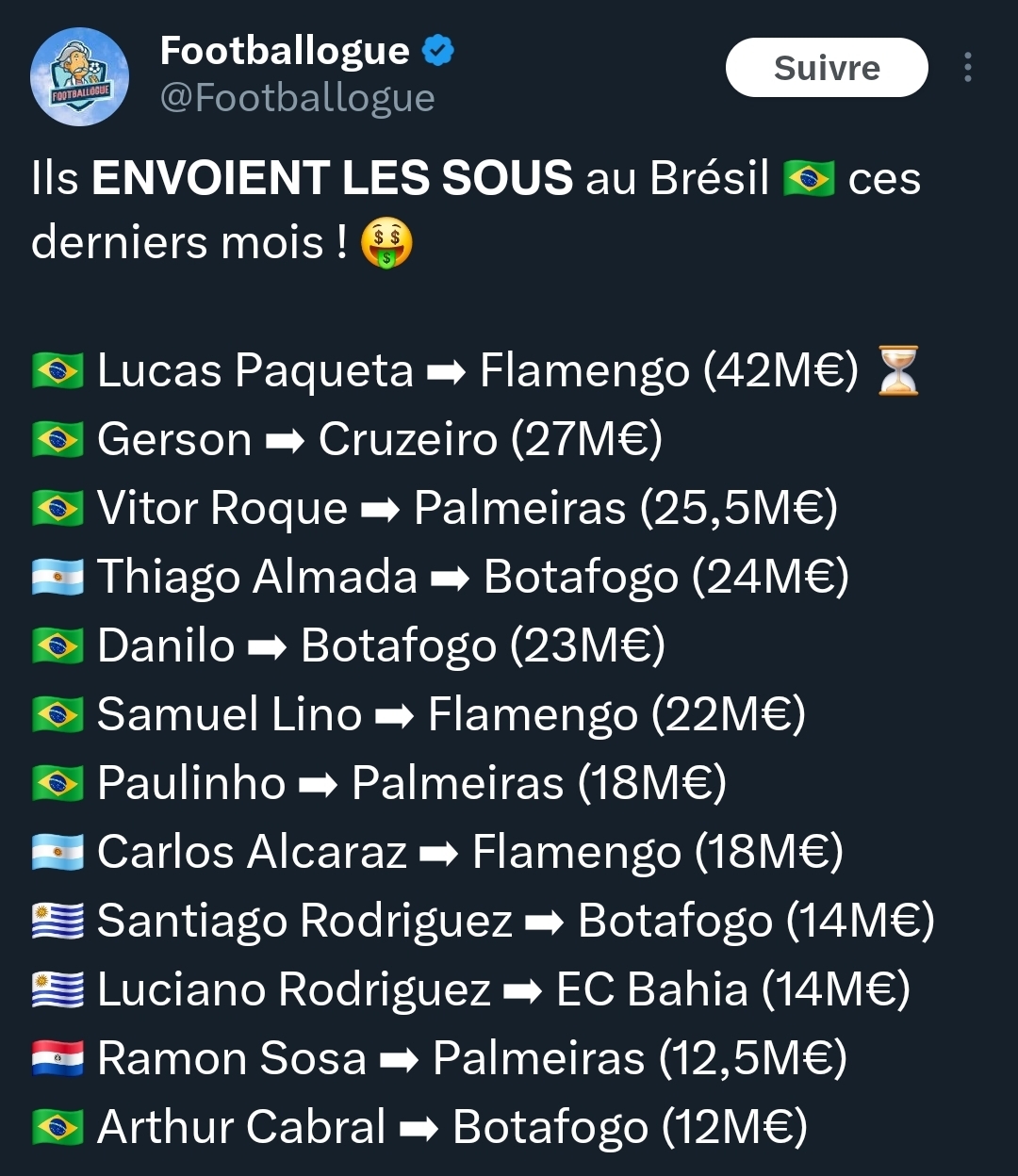 Peut être vous allez revenir sur le cas au mercato hivernal, c’est ce que disent les médias brésiliens. Mais Cruzeiro a du fric illimité donc pourra faire grimper le prix. Attention que ça ne fasse pas une Igor Jesus non plus (énorme surforme, redescente difficile à gérer émotionnellement).